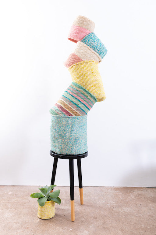 Choose from striped, handwoven sisal baskets in soothing colour combinations that range from faded denim to Biscay green, coral pink, grape compote, saffron and sunlight. Each one is unique – made once and sold once by women working within one of our most creative and rural weaving cooperatives in Kenya.