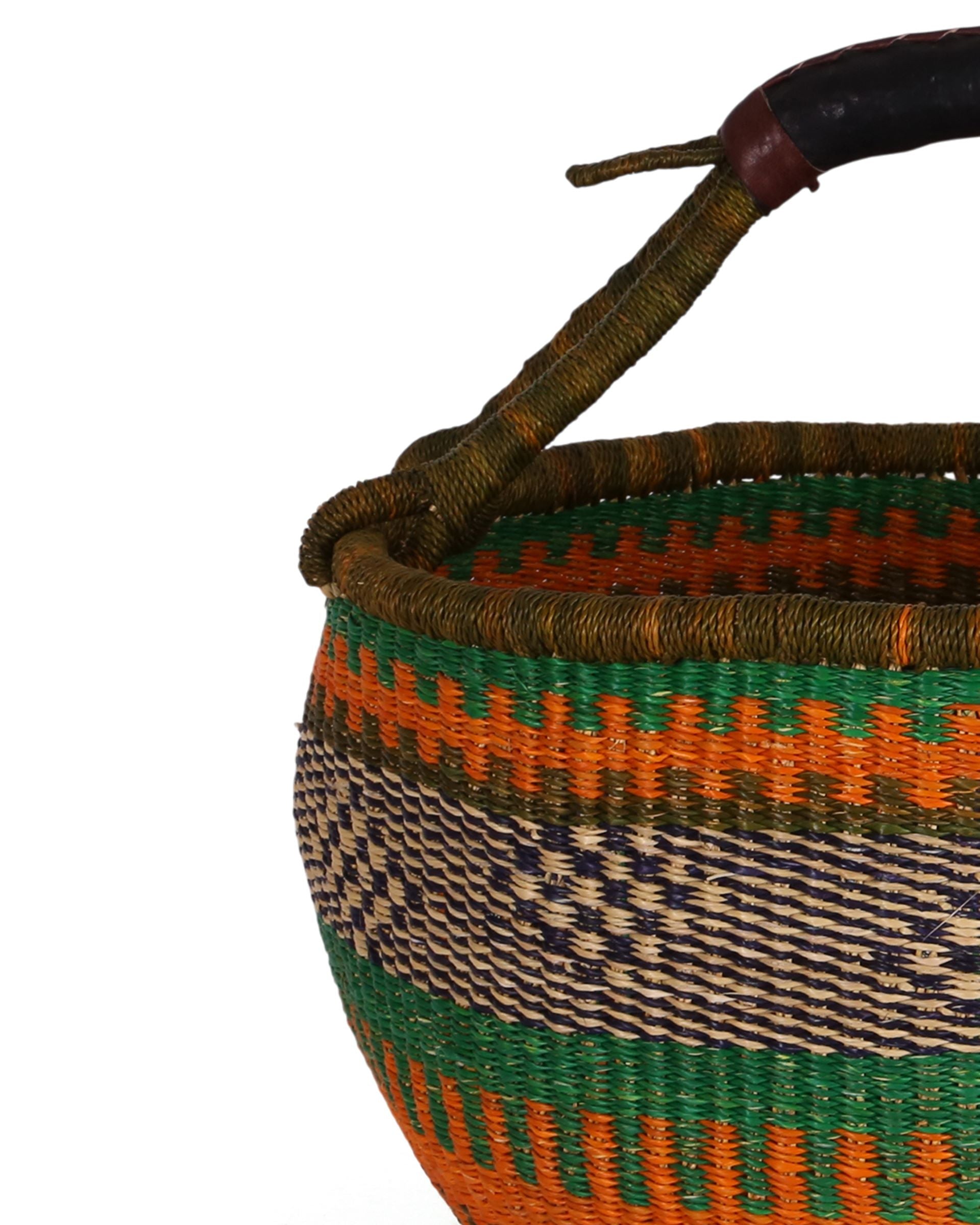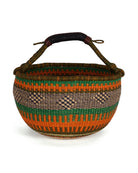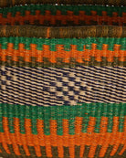 ABRONOMA is a hand woven market basket produced in the traditional Ghanaian bolga basket style. With tribal patterns in Orange, Green & Khaki this basket is perfect for market trips or picnics, but can also be put to use all over the home – as a laundry basket, toy basket, vegetable basket, blanket basket – the possibilities are endless! Every market basket in this collection is totally unique – made once and sold once.