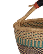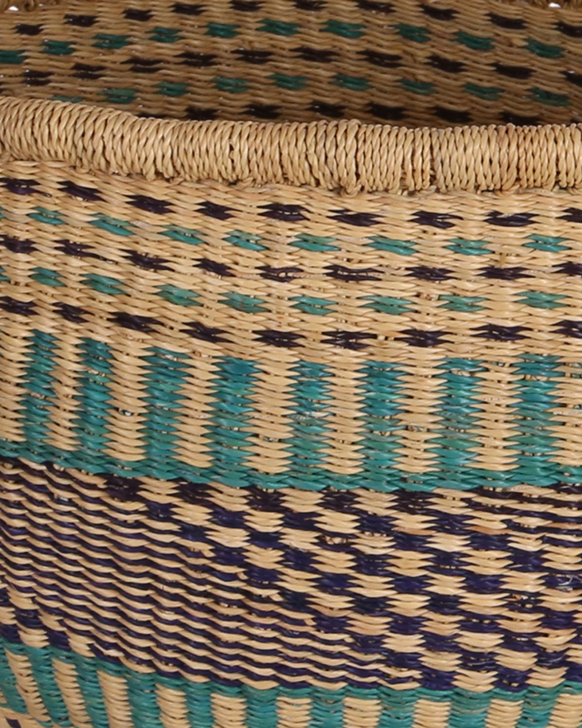 AKYINIM is a hand woven market basket produced in the traditional Ghanaian bolga basket style. With tribal patterns in Turquoise & Navy this basket is perfect for market trips or picnics, but can also be put to use all over the home – as a laundry basket, toy basket, vegetable basket, blanket basket – the possibilities are endless! Every market basket in this collection is totally unique – made once and sold once.
