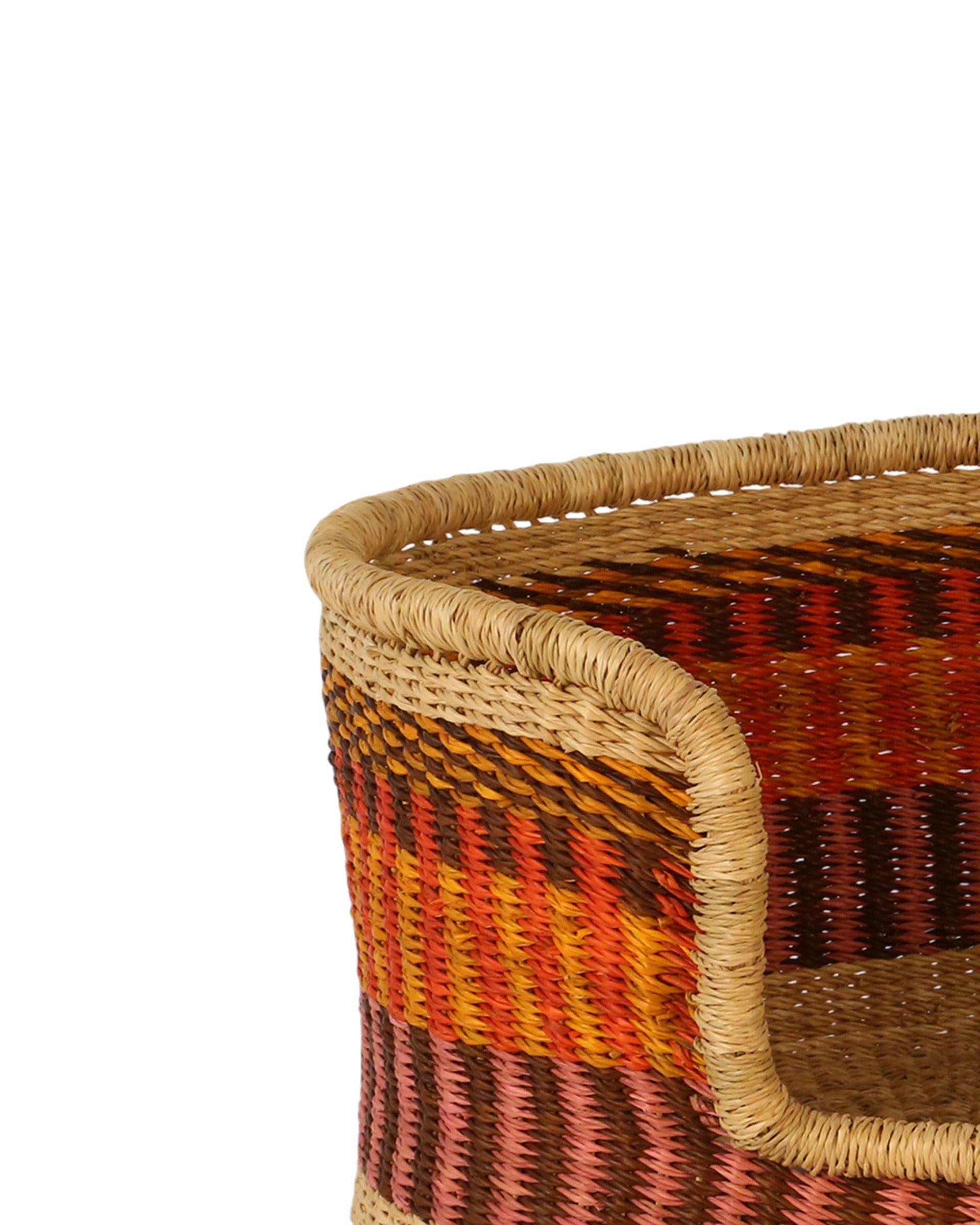 Woven from indigenous veta vera grasses in Northern Ghana - also known as Elephant Grass - each pet basket takes up to three days to weave by hand. The production process is lengthy: this Ghanaian grass is harvested, split, hand-rolled and dyed before a skilled weaver from our partner weaving cooperative in sets to work.
