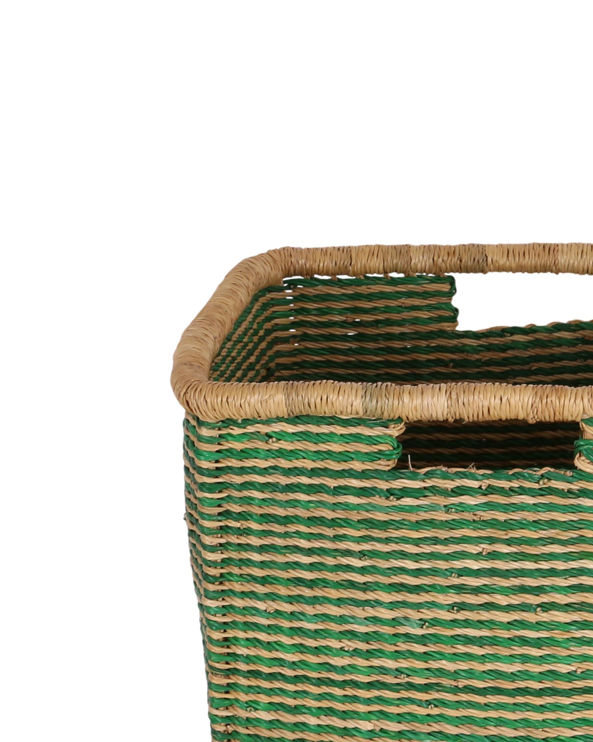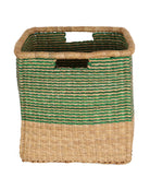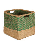 Woven by hand in Ghana, this square woven storage basket fits the cubbies of the IKEA KALLAX unit, to maximise your storage space. With a natural-tone base and top, and a pretty green and natural weave through the sides, let this green woven basket hide away your things so any clutter can be your little secret.