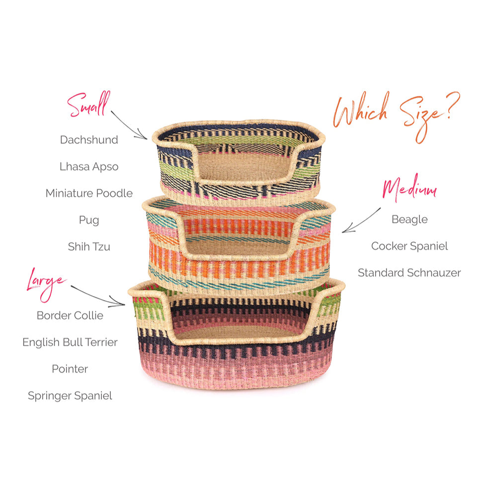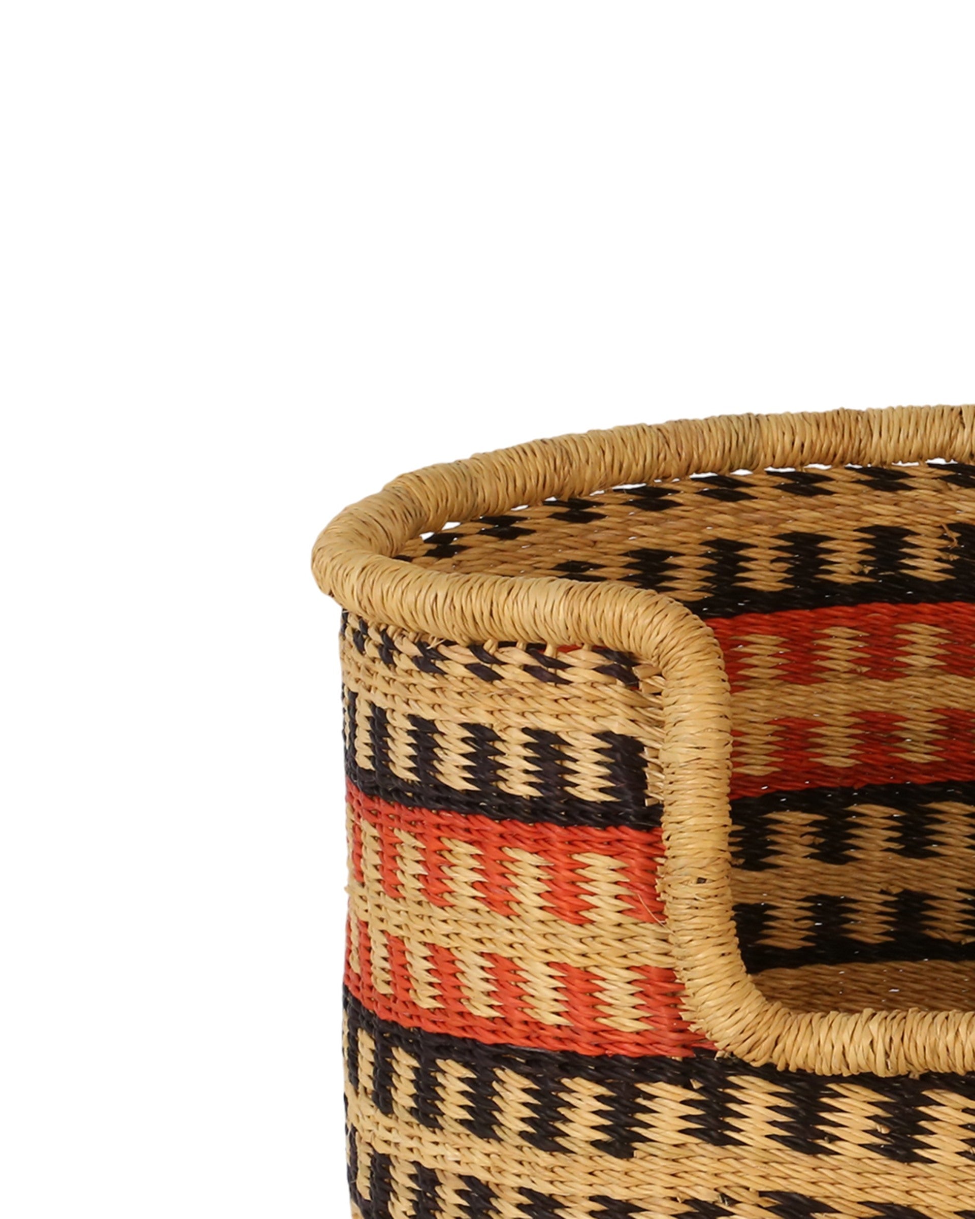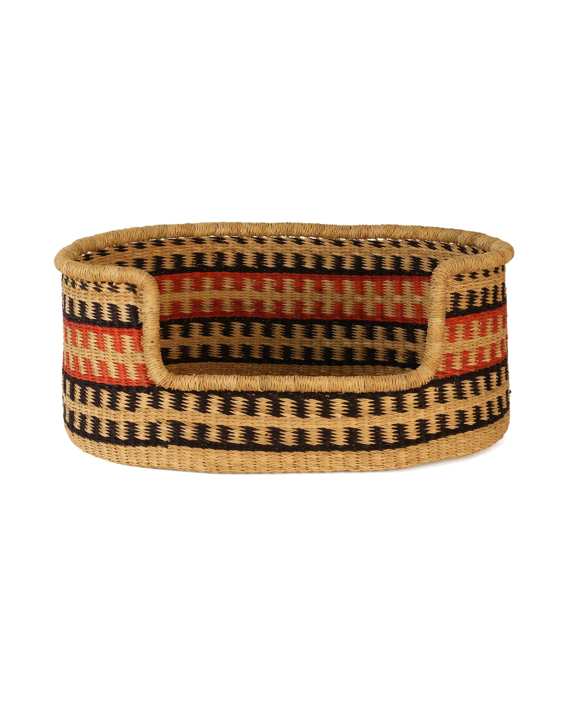 Woven from indigenous veta vera grasses in Northern Ghana - also known as Elephant Grass - each pet basket takes up to three days to weave by hand. The production process is lengthy: this Ghanaian grass is harvested, split, hand-rolled and dyed before a skilled weaver from our partner weaving cooperative in sets to work.