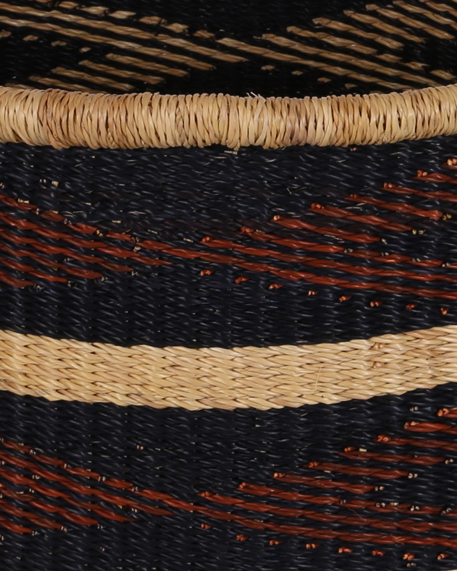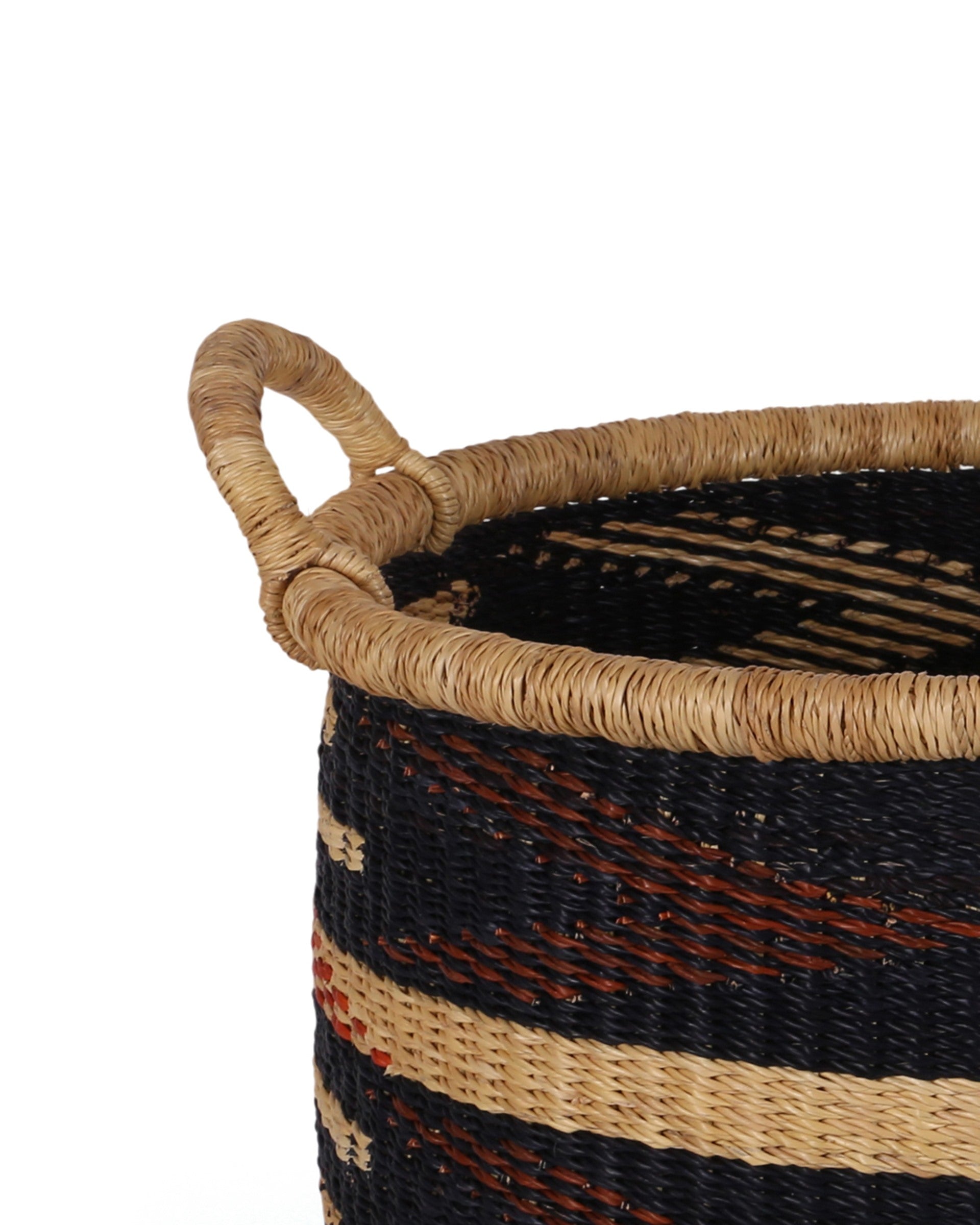 Each one of these unique, floor baskets take up to three days to weave by hand, using veta vera grass which produces baskets of excellent structural balance and durability. This indigenous grass is hand picked from the tip, hand-rolled and dyed in boiling water before being woven by a skilled member of our partner weaving cooperative in Northern Ghana.