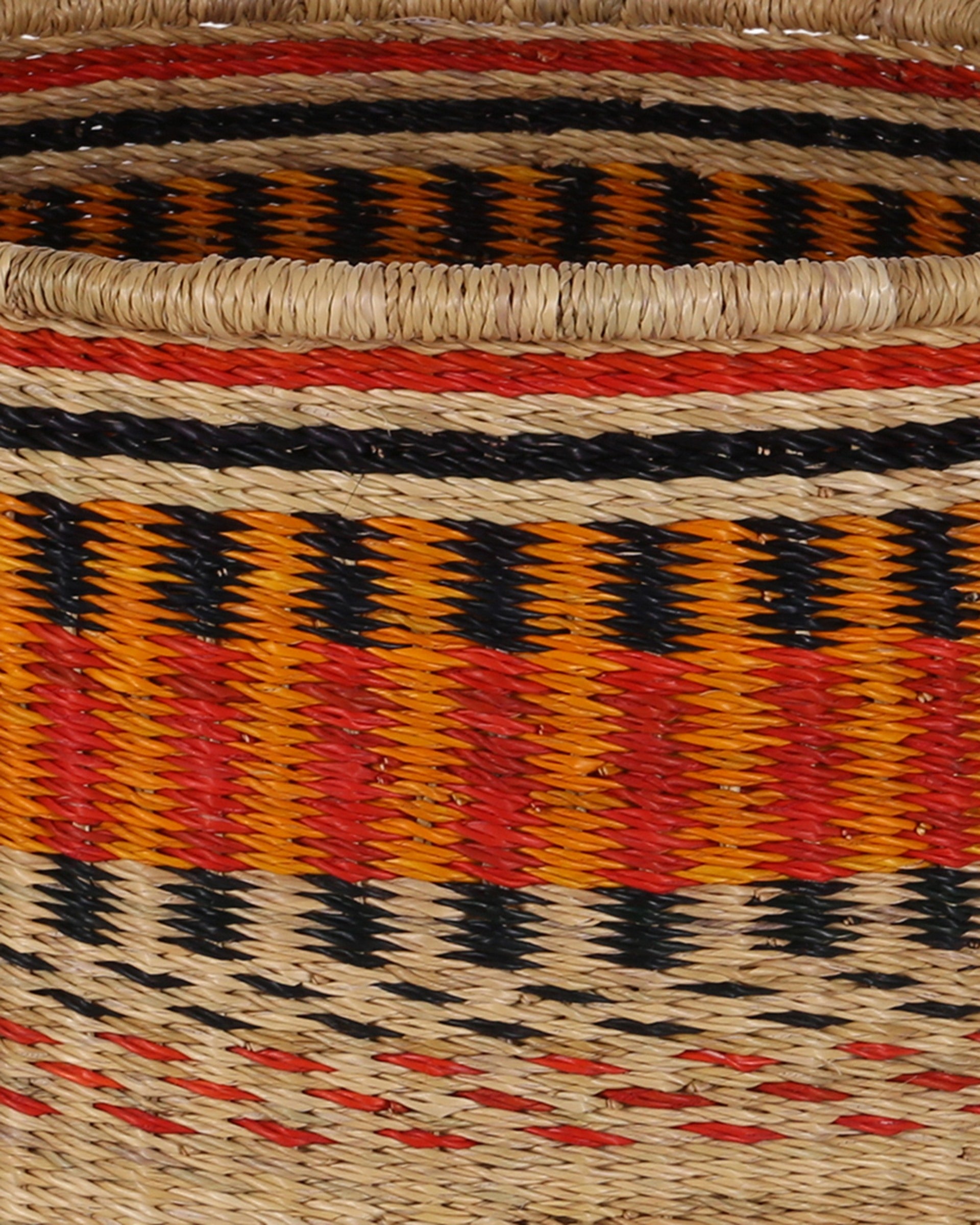 Each one of these unique, floor baskets take up to three days to weave by hand, using veta vera grass which produces baskets of excellent structural balance and durability. This indigenous grass is hand picked from the tip, hand-rolled and dyed in boiling water before being woven by a skilled member of our partner weaving cooperative in Northern Ghana.