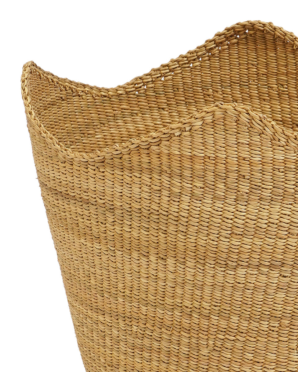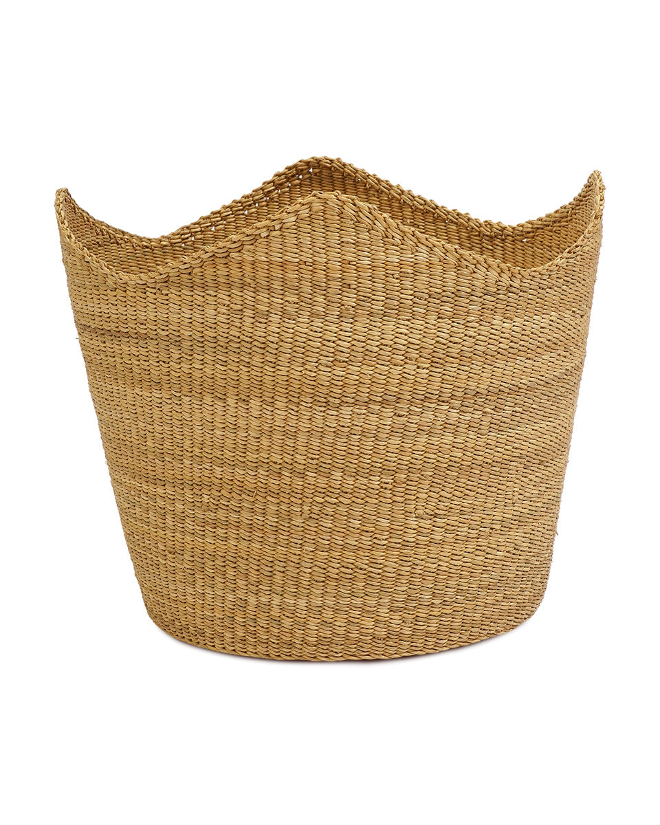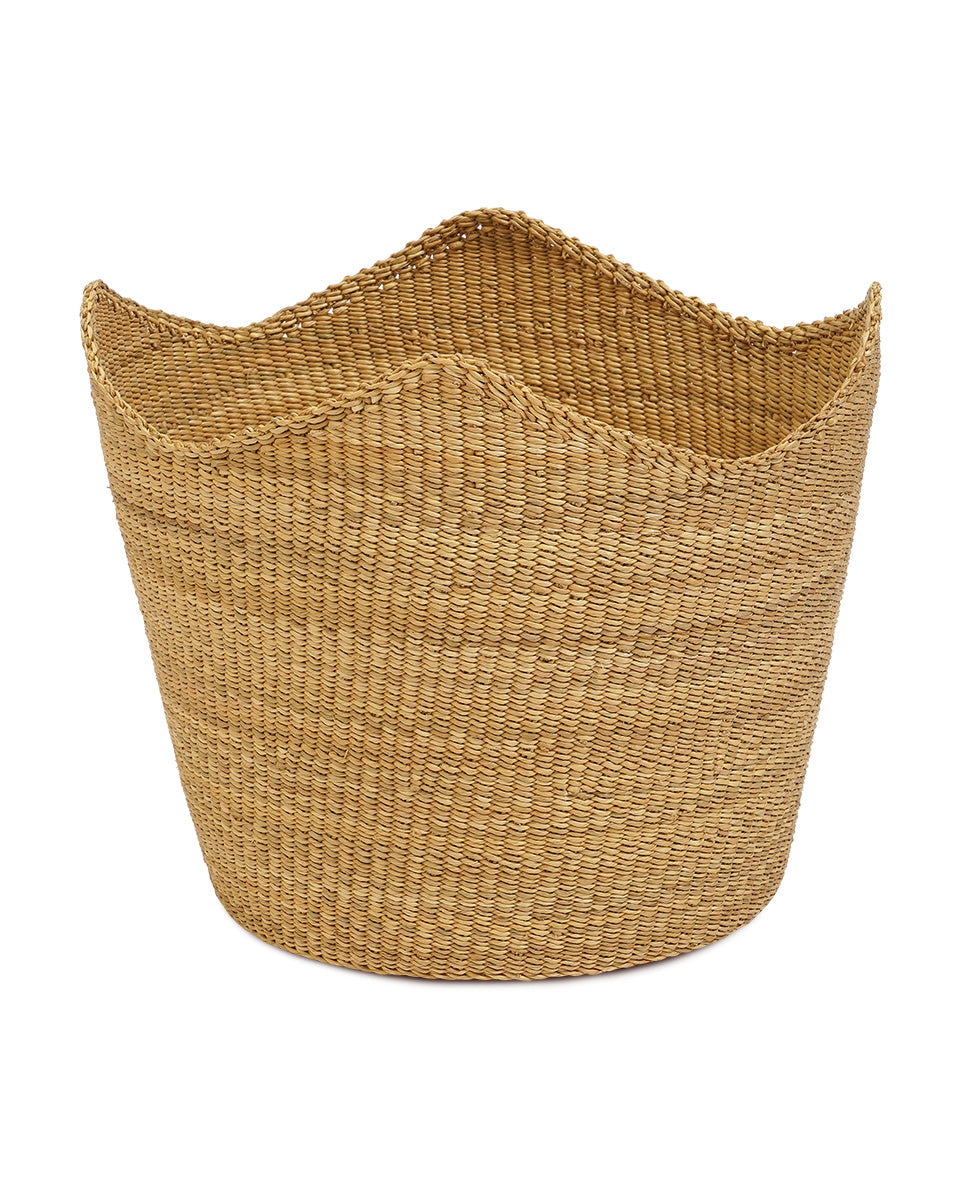 A classic natural round storage basket with a unique twist: our TAFO sculptural woven basket has a softly curved scalloped edge. This gives each basket a charming crown effect that will add a unique touch of regal elegance to your space.