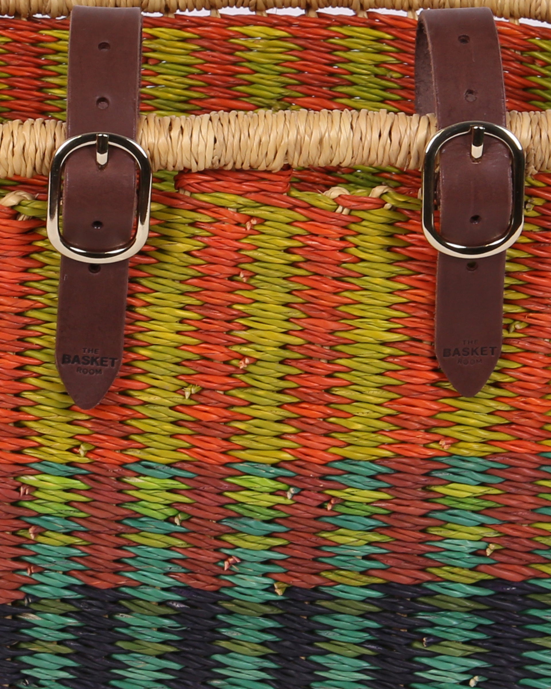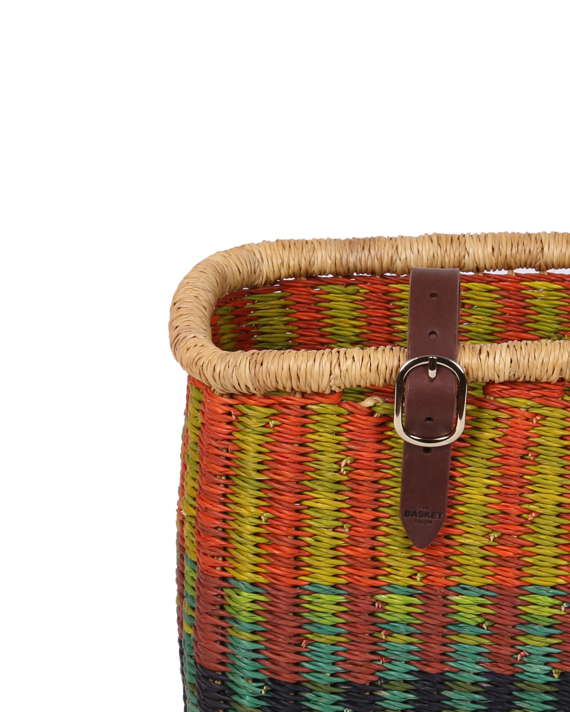 Give those two wheels an instant upgrade with this beautiful rectangular bicycle basket. KETE is a unique, one of a kind bike basket, featuring a striking design in Orange, Green & Blue . Made from robust veta vera grass then colourfully dyed, the weavers have complete creative freedom resulting in exquisite designs that are only ever made once.