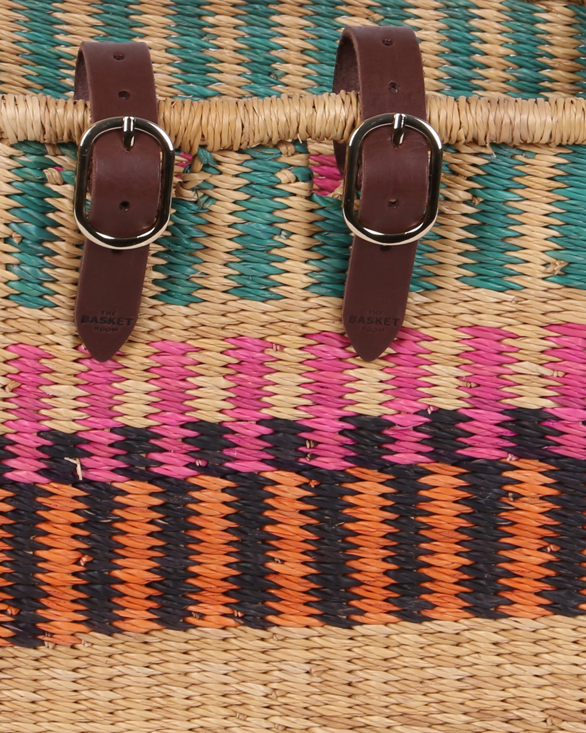 Give those two wheels an instant upgrade with this beautiful rectangular bicycle basket. PULUA is a unique, one of a kind bike basket, featuring a striking design in {COLOUR}Turquoise, Pink & Orange . Made from robust veta vera grass then colourfully dyed, the weavers have complete creative freedom resulting in exquisite designs that are only ever made once.