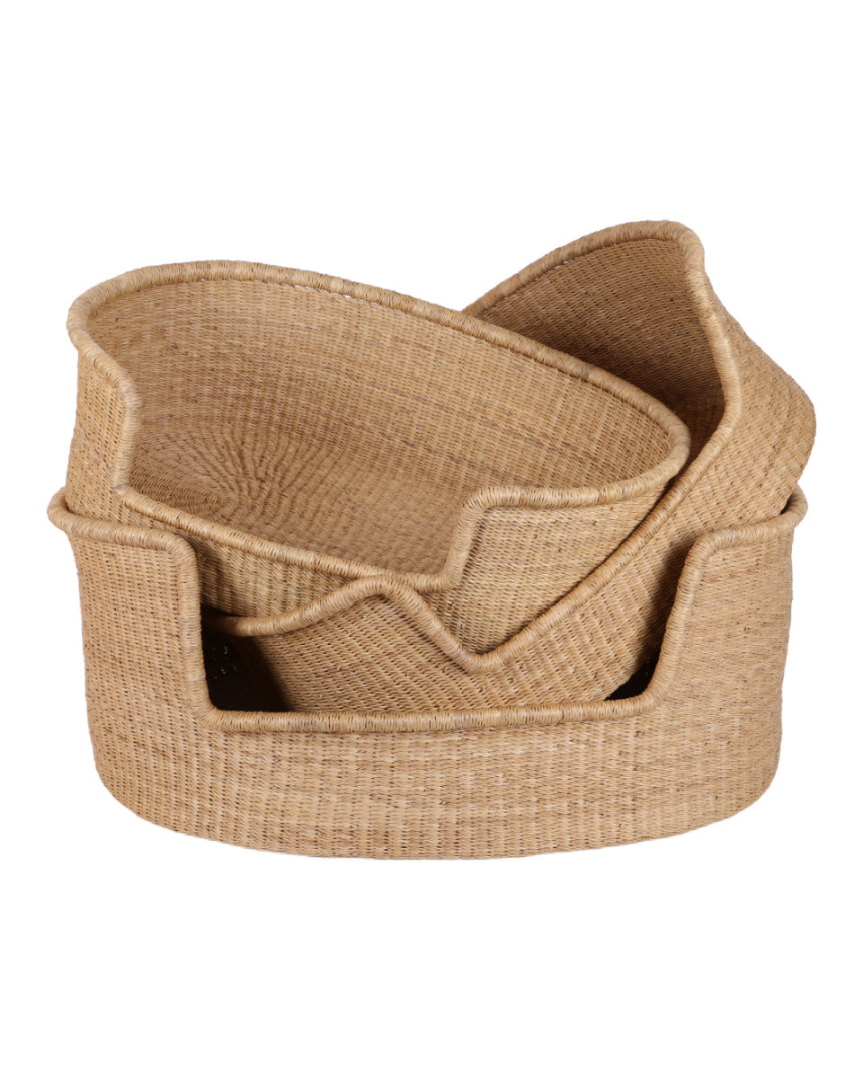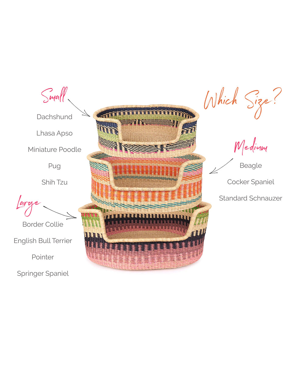 Create an attractive and cosy sleeping space for your four-legged friend with one of our stunning handwoven dog baskets, ethically and sustainably-produced in Ghana from sturdy veta vera grasses. Choose from three different dog basket sizes and many beautiful designs: we’ve got a colour scheme to work with every interior style and a size to fit virtually every breed of pooch!