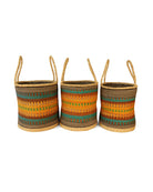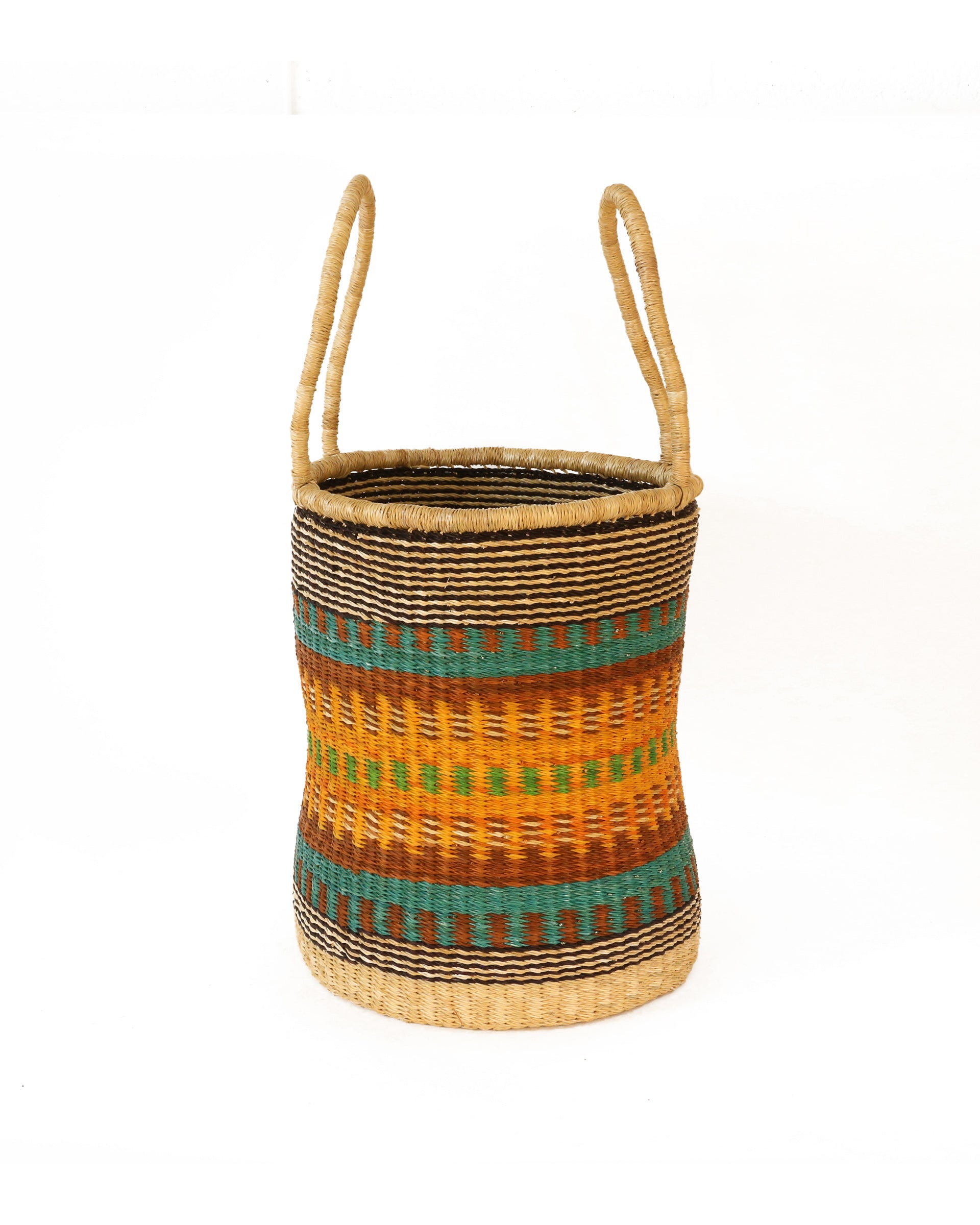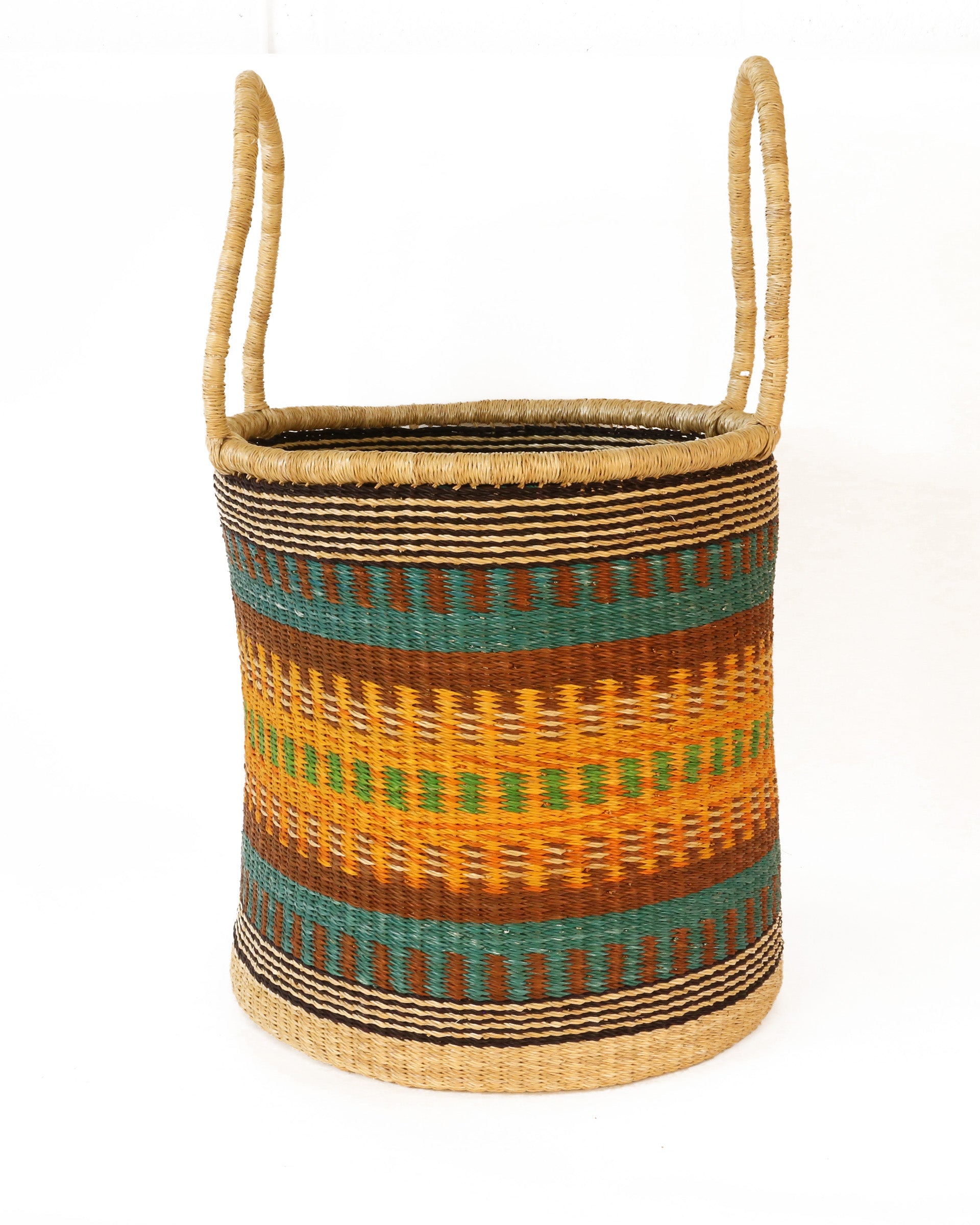 Declutter and bring a splash of Ghanaian colour to your home with the ACDJO log basket, in sizes small, medium and large. With tribal-inspired patterns in blue, orange and green, these tall baskets are perfect for storing kindling and logs by the fireside and are useful all over the home – as a laundry basket, toy basket, or blanket basket – the possibilities are endless! Every log basket in this collection is totally unique – made once and sold once.