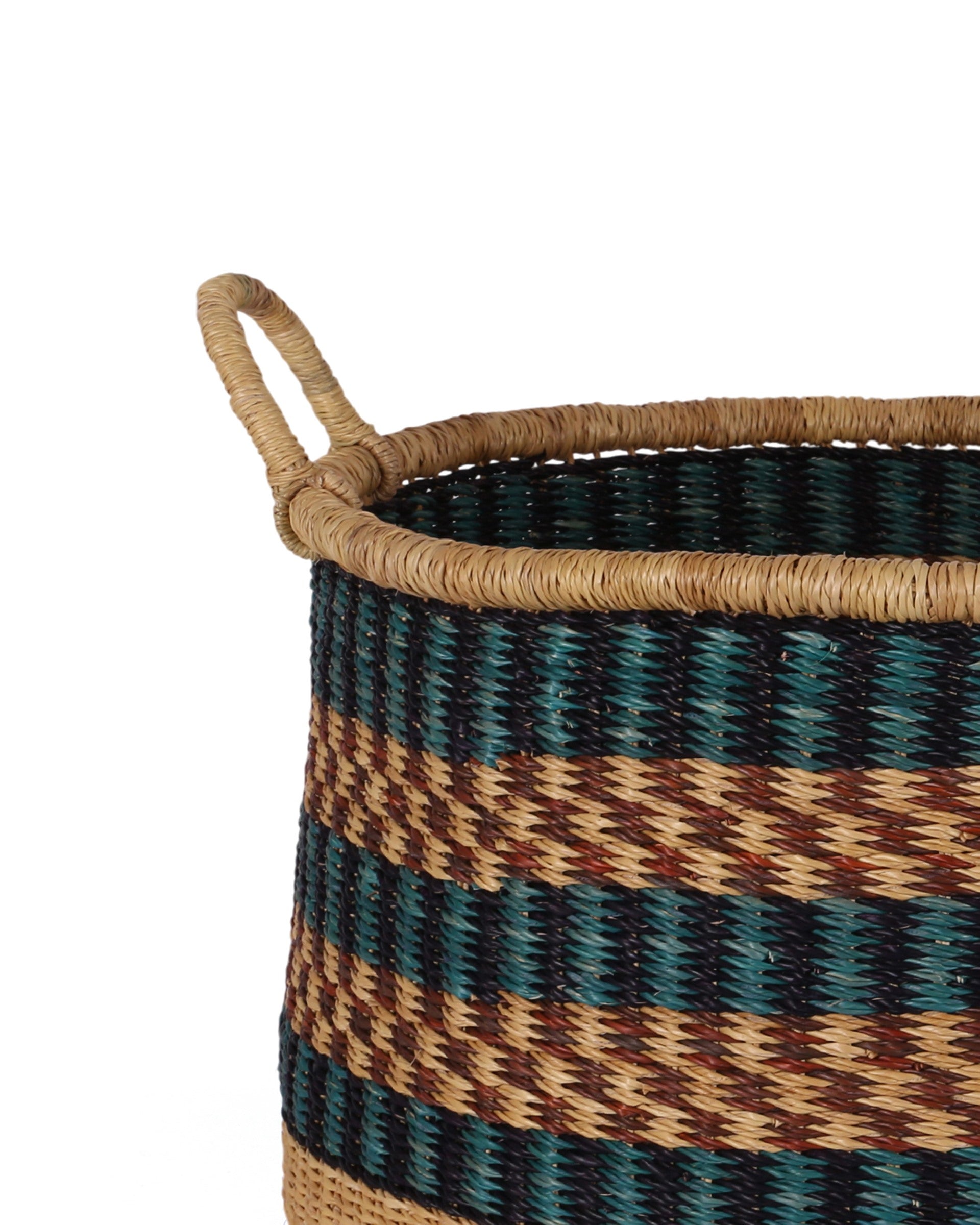 Woven from ethically-sourced veta vera grass in Northern Ghana, this colourful storage basket is made from robust veta vera grass – an indigenous raw material that’s sustainably sourced and perfect for producing really strong baskets. This is the same fibre that’s used to produce our moses baskets, dog baskets and bike baskets.  The grass is hand-rolled before being woven by a skilled member of our partner weaving cooperative in Northern Ghana.