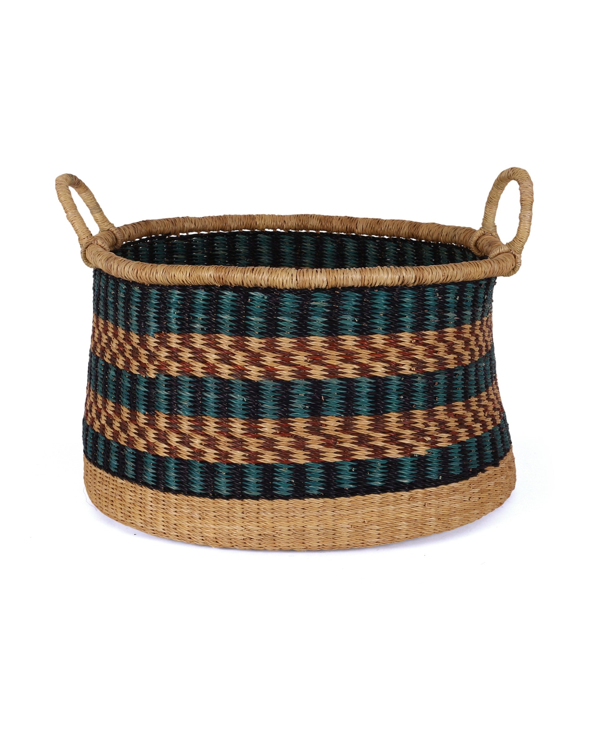Transform your space and bring a dash of Ghanaian colour to your home with the KROBO round floor basket, in a medium size. With teal, navy and brown tribal patterns, this basket is perfect for storing kindling and logs but can also be put to use all over the home – as a laundry basket, toy basket, vegetable basket, blanket basket – the possibilities are endless! Every round storage basket in this collection is totally unique – made once and sold once.
