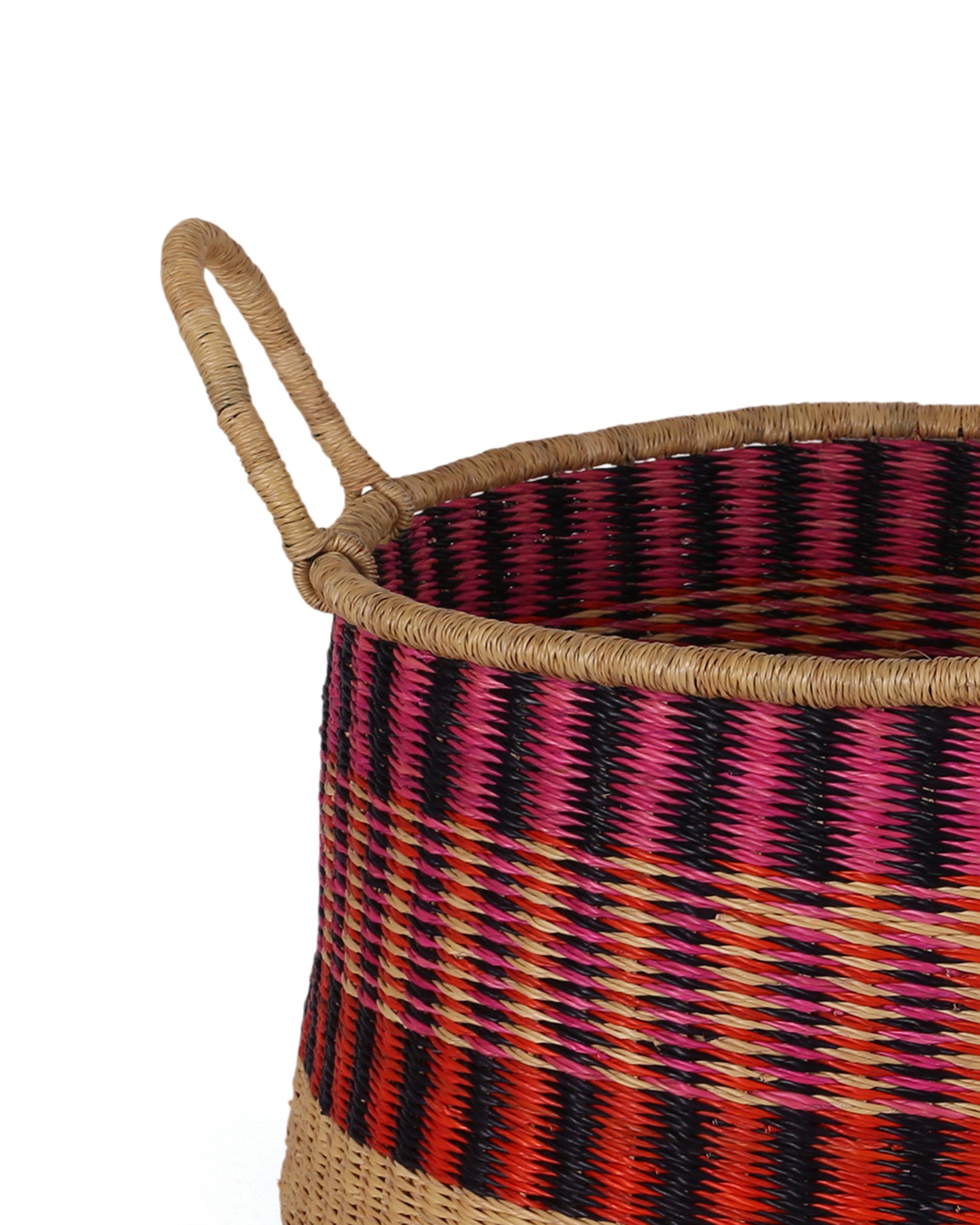 Makeover your home and declutter at the same time with the KWAMAN floor basket, in a large size. With geometric patterns in pink, red and black, this ethically-produced basket is perfect for filling with kindling and logs but it can also be put to use all over the home. Yours could become a laundry basket, toy basket, vegetable basket or blanket basket, for example! Every round storage basket in this collection is totally unique – made once and sold once.