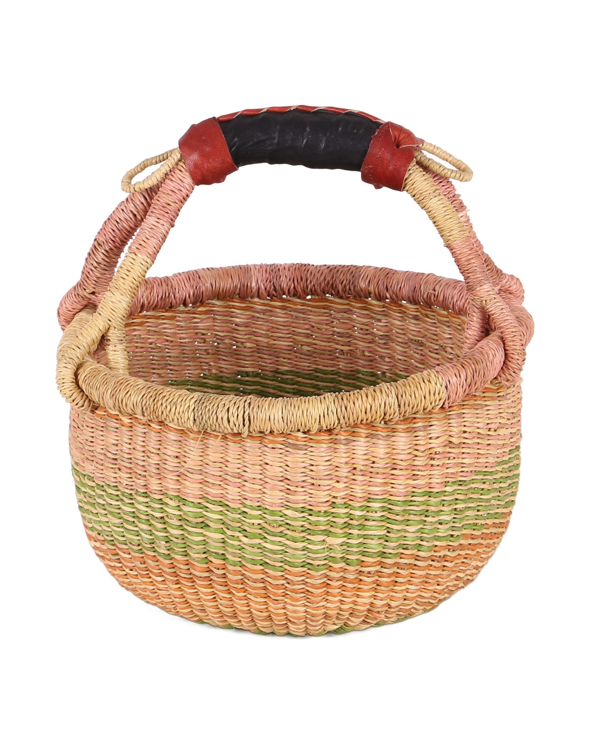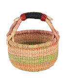 We have reimagined our beautiful bolga market baskets in miniature, for our littlest customers! MANORGBE is a unique round basket with a woven grass carry handle, featuring bands of pink, green and orange.