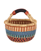 We have reimagined our beautiful bolga market baskets in miniature, for our littlest customers! MAWUFEASI is a unique round basket with a woven grass carry handle, featuring bands of brown, turquoise and orange.