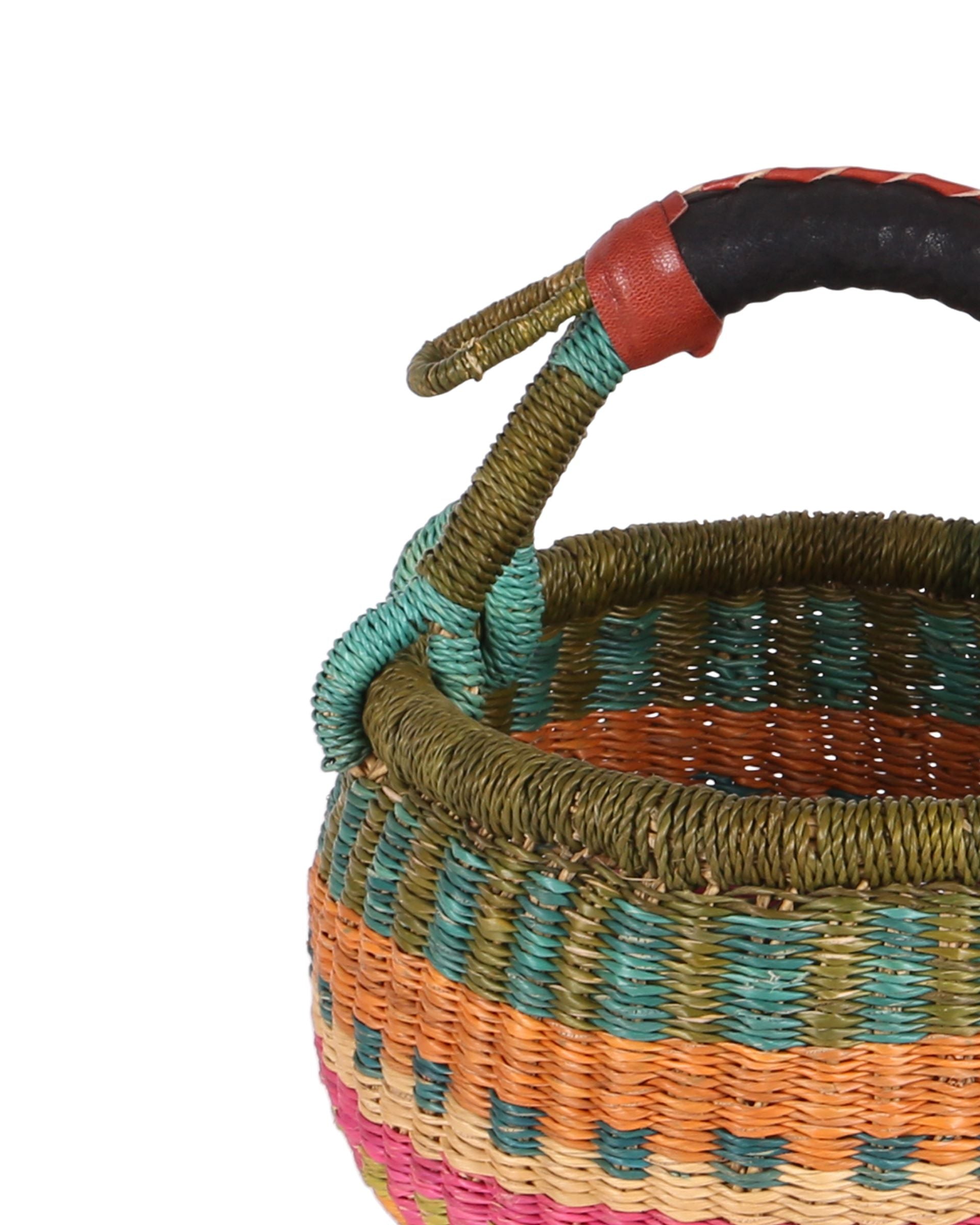 We have reimagined our beautiful bolga market baskets in miniature, for our littlest customers! MAWULI is a unique round basket with a woven grass carry handle, featuring bands of khaki, orange and pink.