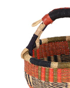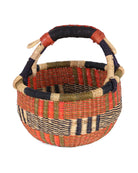 We have reimagined our beautiful bolga market baskets in miniature, for our littlest customers! NANA is a unique round basket with a woven grass carry handle, featuring bands of orange and black.
