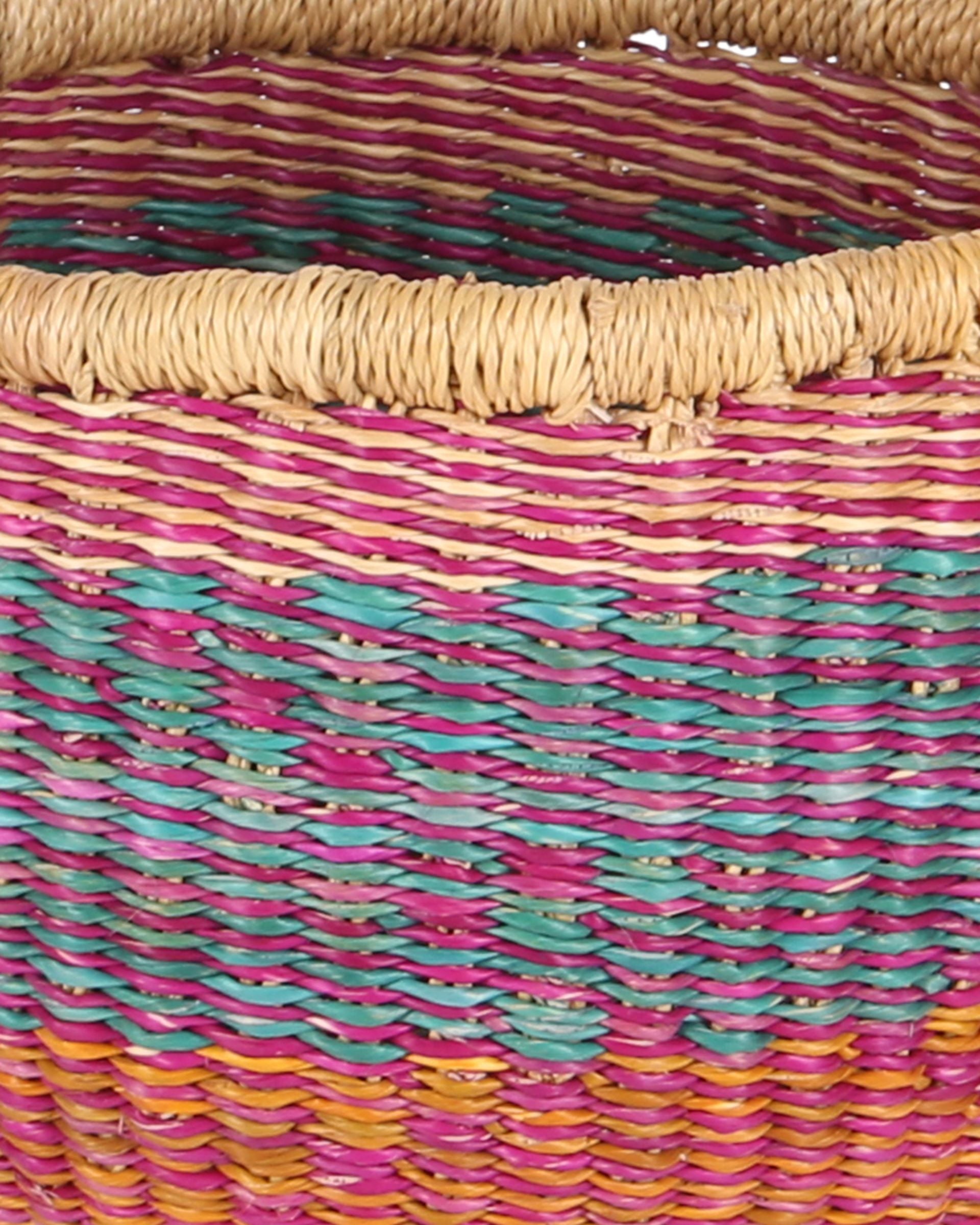 We have reimagined our beautiful bolga market baskets in miniature, for our littlest customers! NKRUMAH is a unique round basket with a woven grass carry handle, featuring bands of purple, blue and orange.