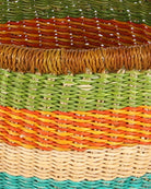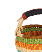 We have reimagined our beautiful bolga market baskets in miniature, for our littlest customers! OHENE is a unique round basket with a woven grass carry handle, featuring bands of green, orange and blue.