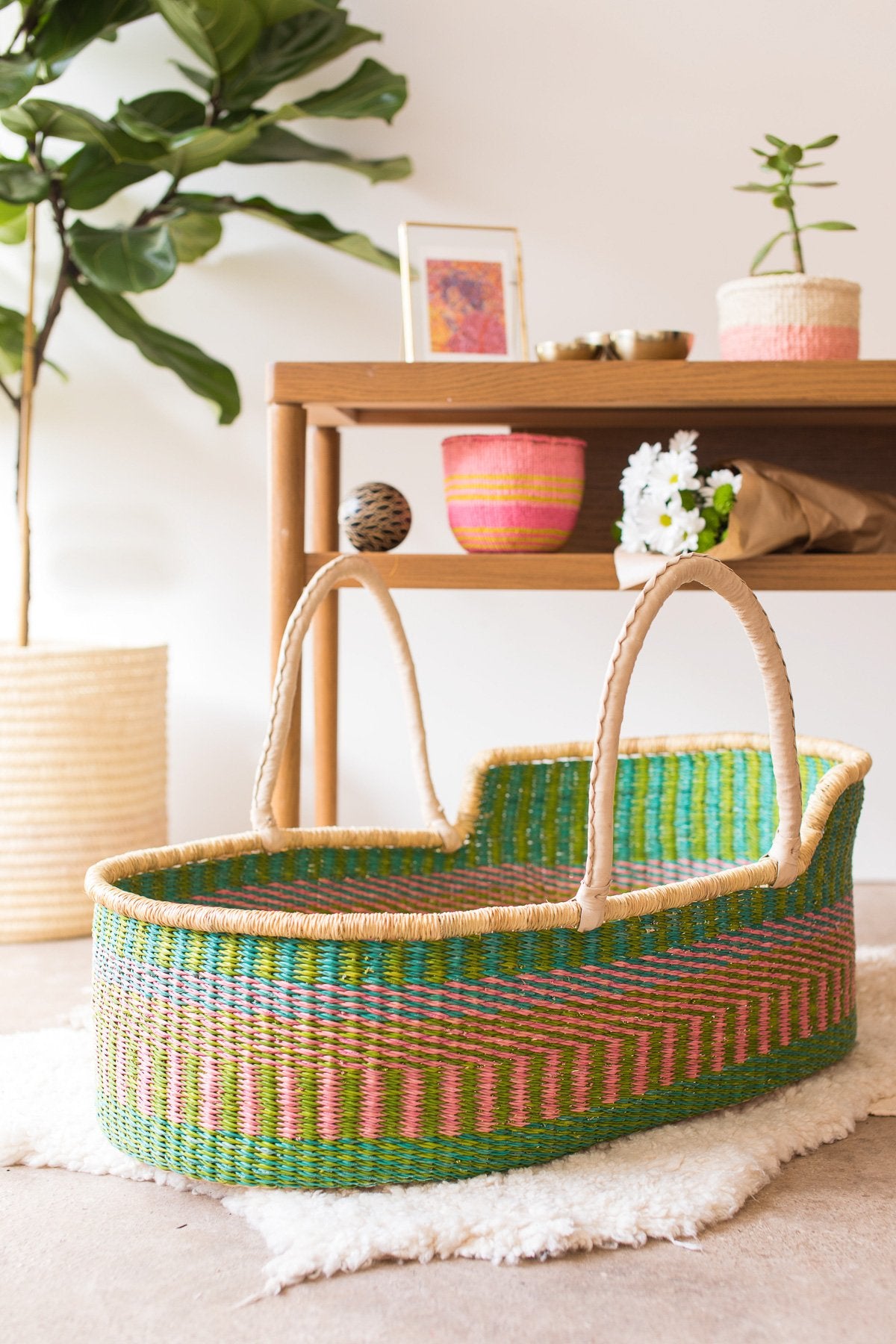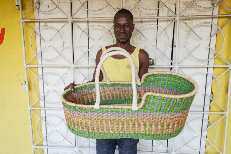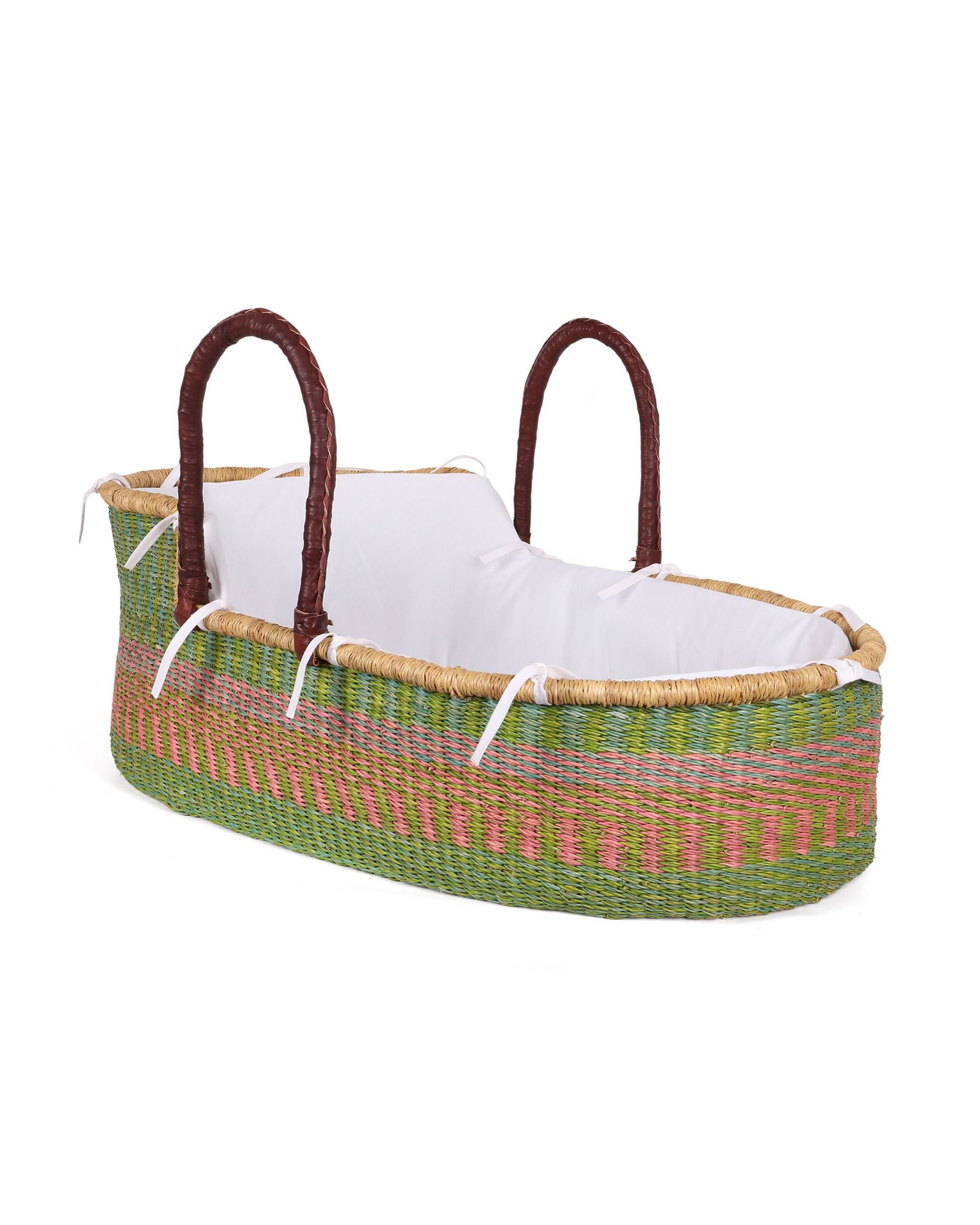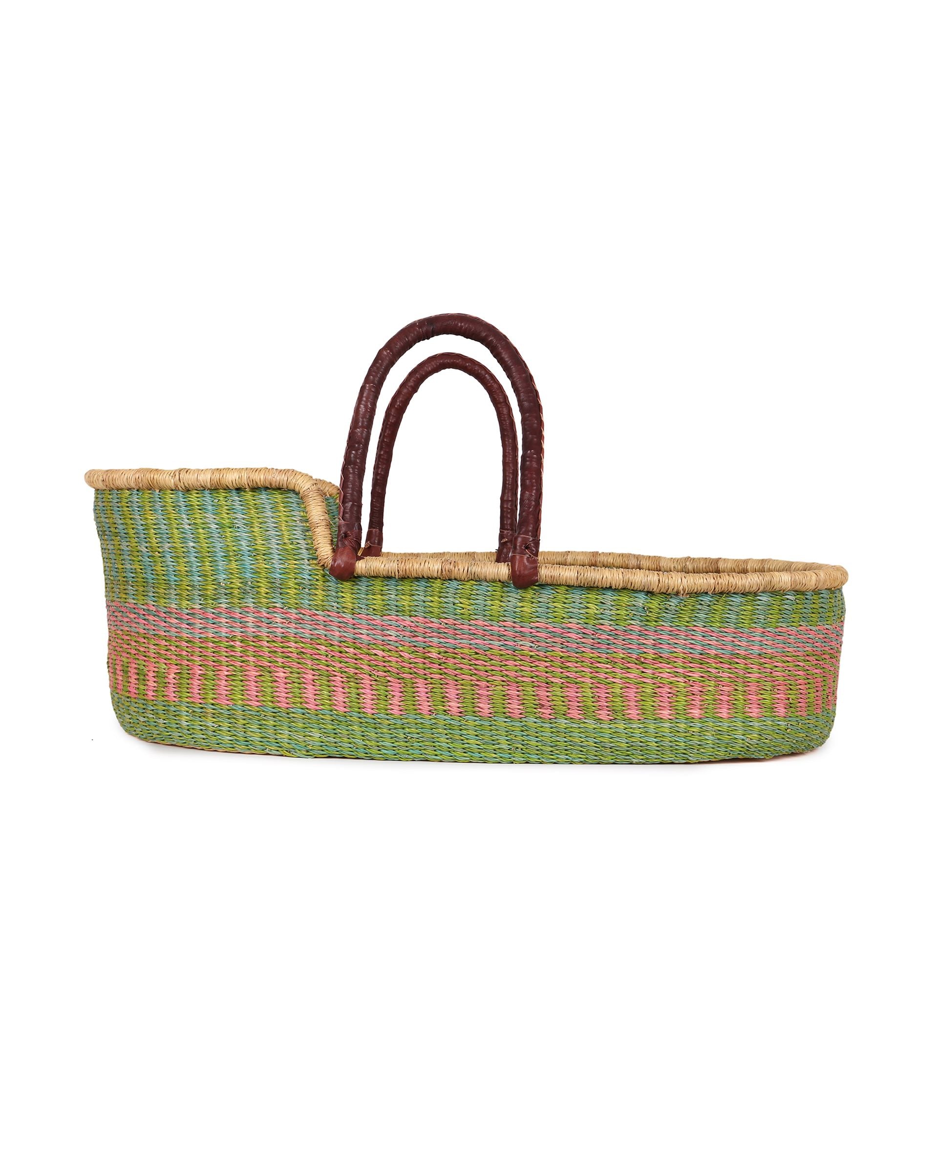 Meet our award winning Moses baskets: winners of the bronze award for best baby crib, pod or Moses design in the Junior Design Awards 2021. Keep a close eye on baby as they nap in comfort and style with our exquisite woven baby baskets. These hand woven Moses baskets are ethically hand made in Northern Ghana: nine different moses basket designs finished in sustainably-sourced goat’s leather. We think you’ll be hard pressed to find an ethical baby gift that brings more joy and delight than one of these babies.