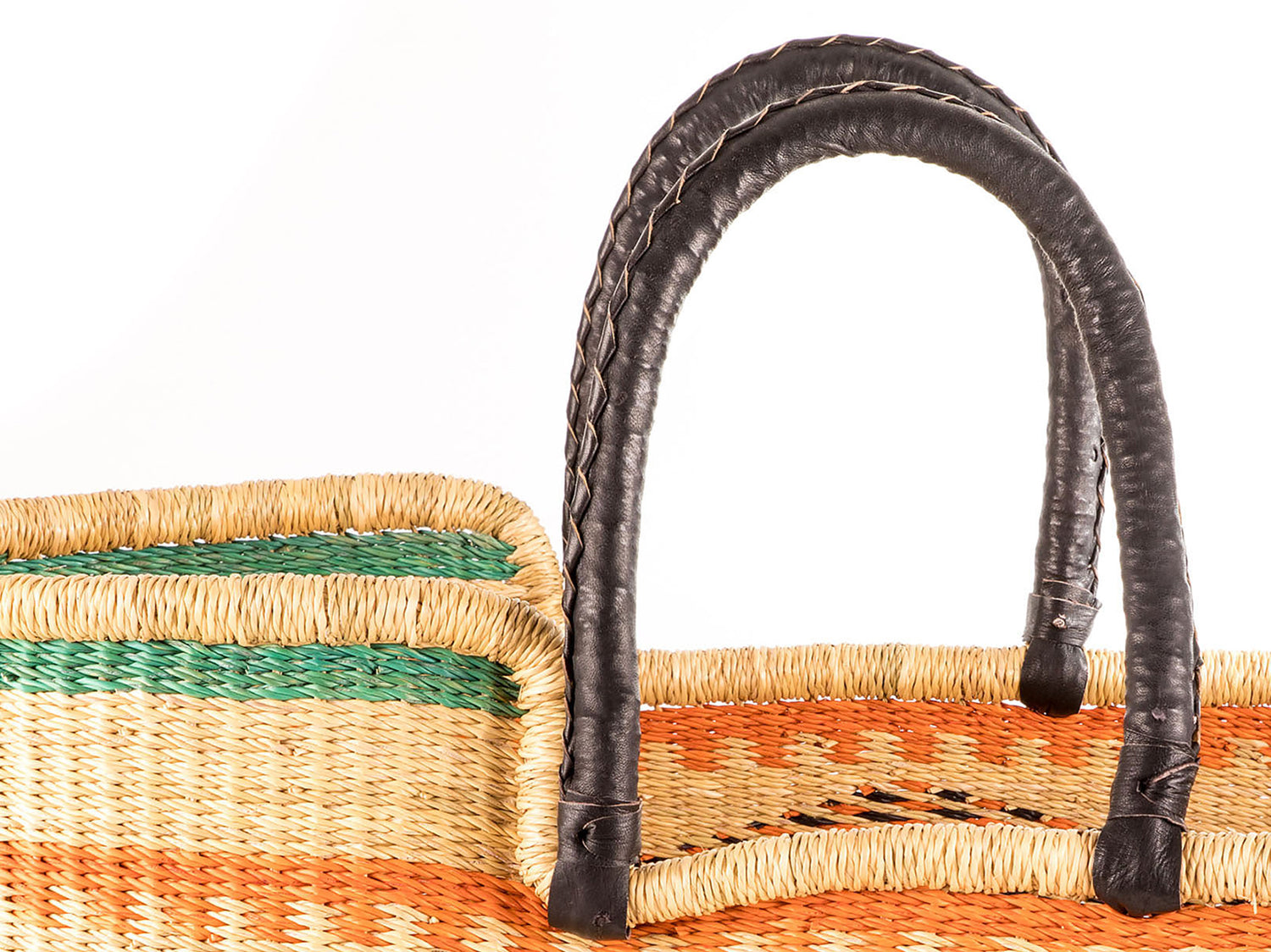 A central diamond design in black and orange geometric stripes, with tribal-inspired stripes in deep orange, black and minty green – and brown goat’s leather carry handles.