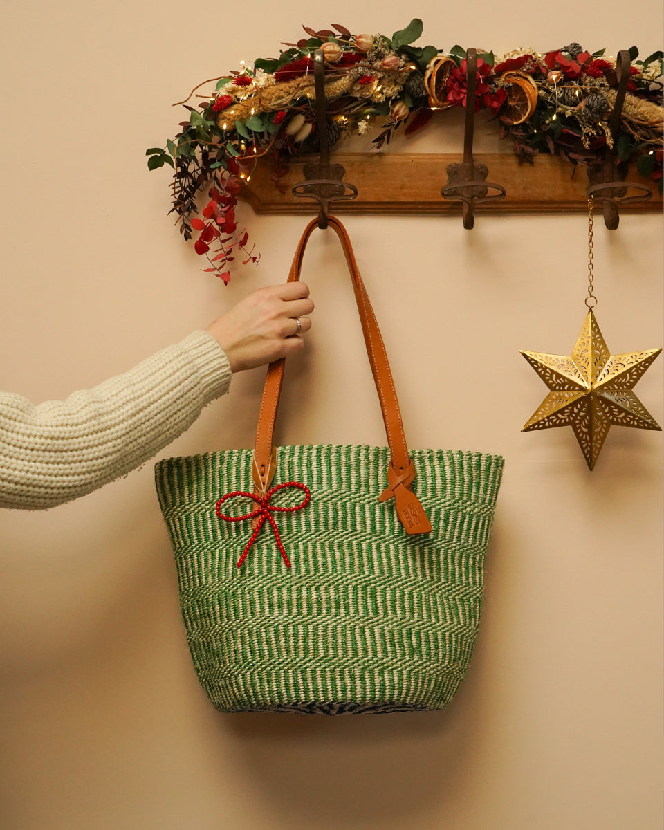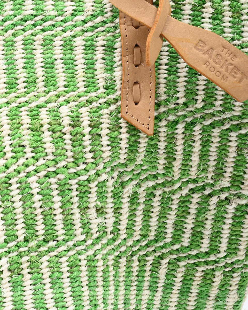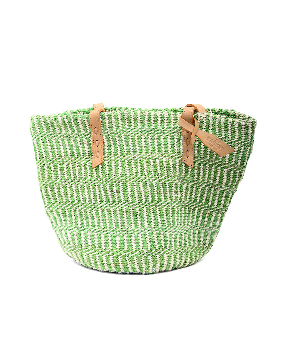 The Basket Room partners with a network of twelve Kenyan weaving groups - with over thirty weavers in each group – to produce these green and blue striped woven totes. Weaving each basket bag can take up to six days: this is flexible work that fits in around domestic work, childcare and farming. Finished baskets are then sent to a Nairobi leather workshop where cow hide shoulder straps are produced and attached by skilled leatherworkers.