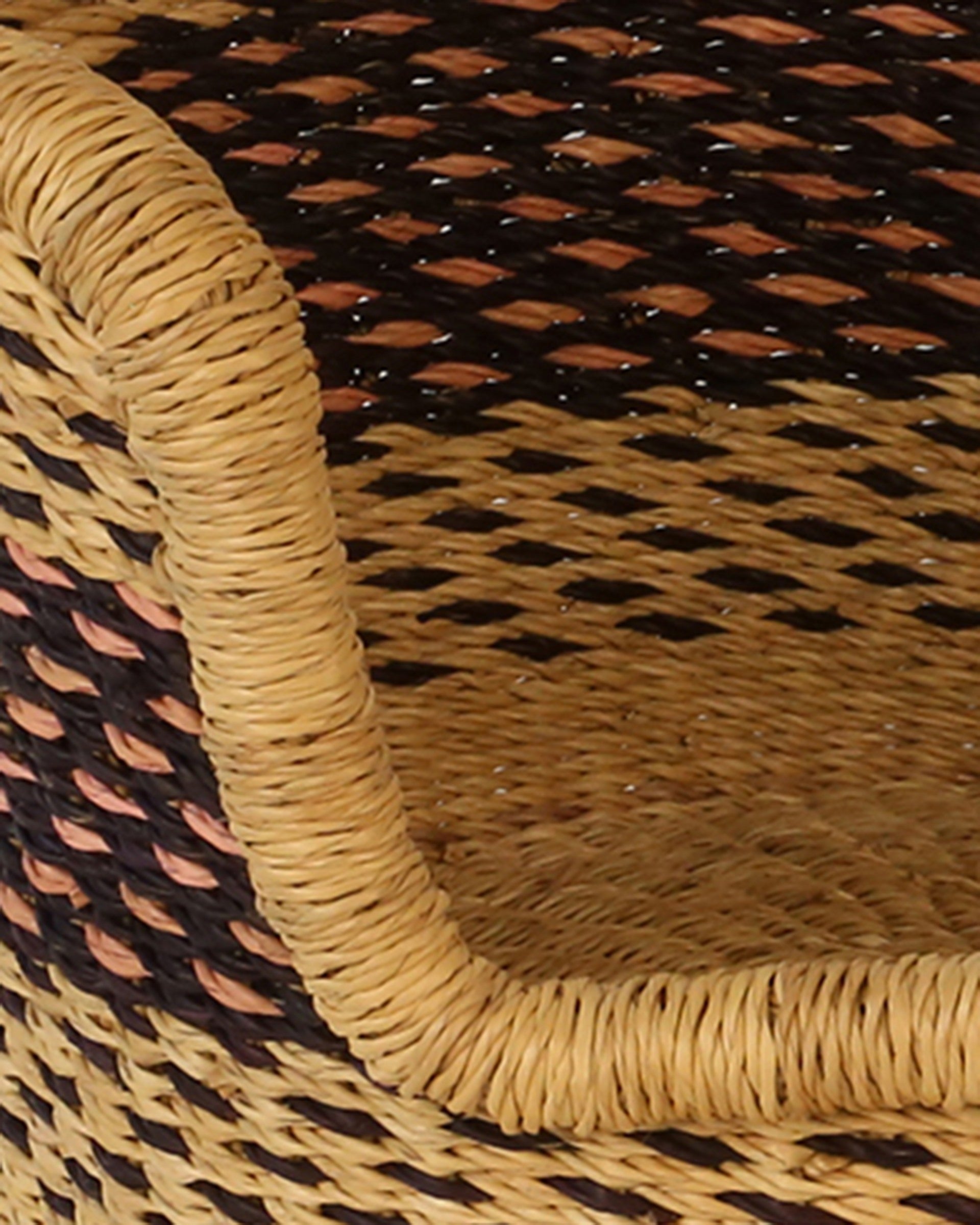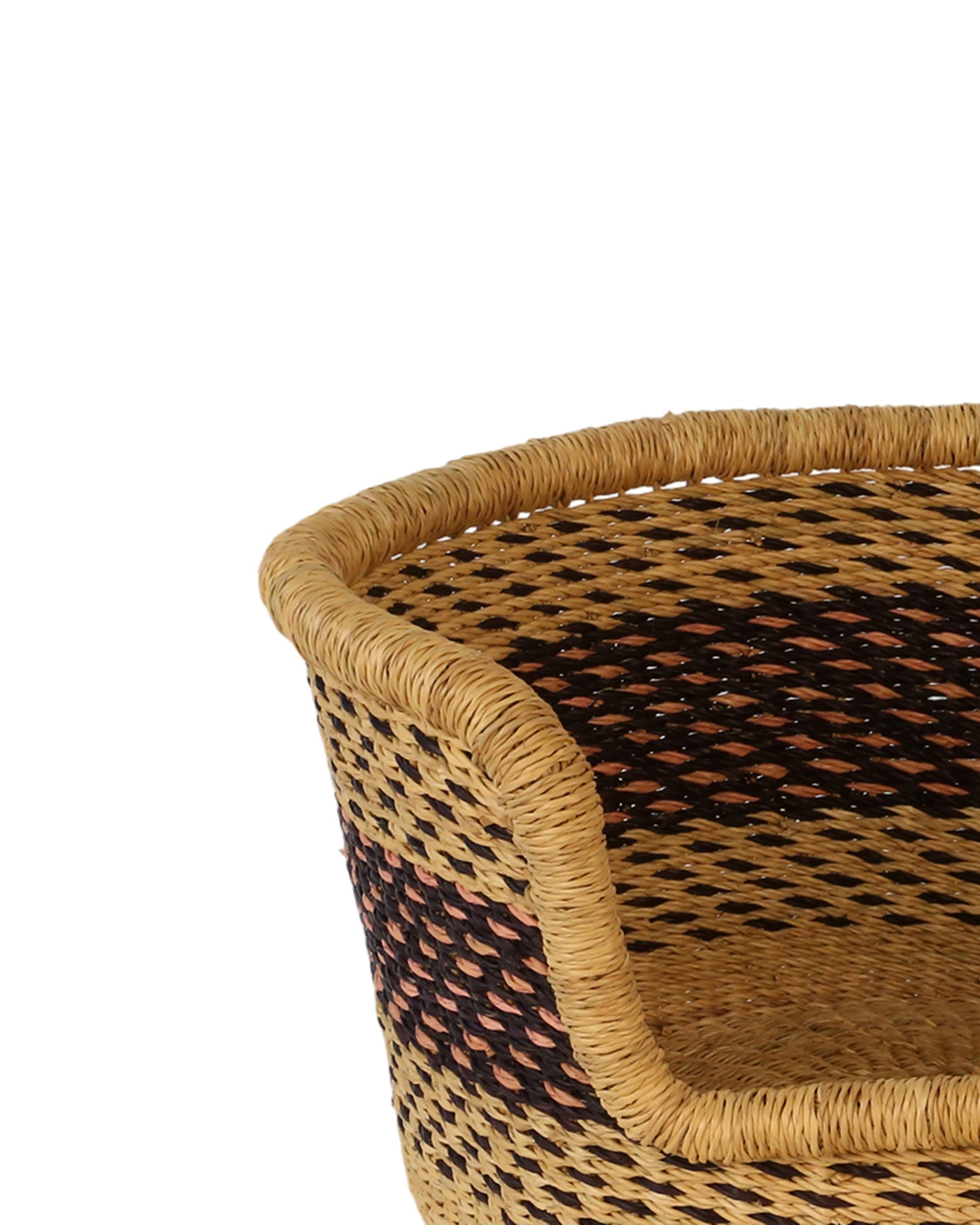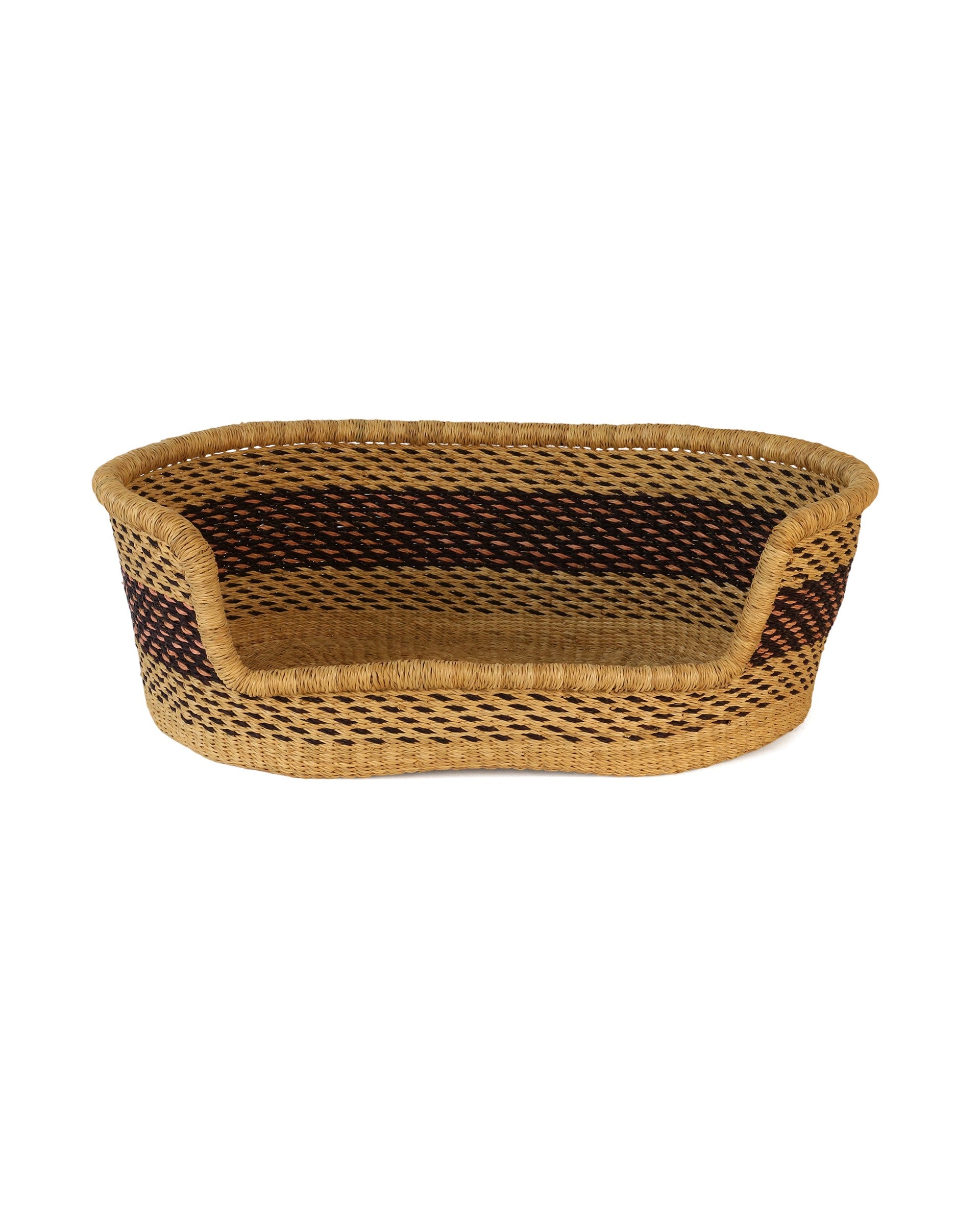 Woven from indigenous veta vera grasses in Northern Ghana - also known as Elephant Grass - each pet basket takes up to three days to weave by hand. The production process is lengthy: this Ghanaian grass is harvested, split, hand-rolled and dyed before a skilled weaver from our partner weaving cooperative in sets to work.