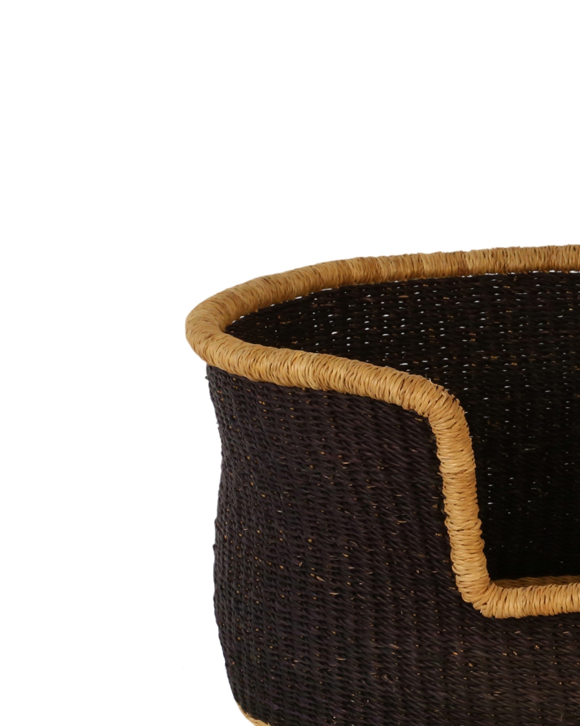 Woven from indigenous veta vera grasses in Northern Ghana - also known as Elephant Grass - each pet basket takes up to three days to weave by hand. The production process is lengthy: this Ghanaian grass is harvested, split, hand-rolled and dyed before a skilled weaver from our partner weaving cooperative in sets to work.