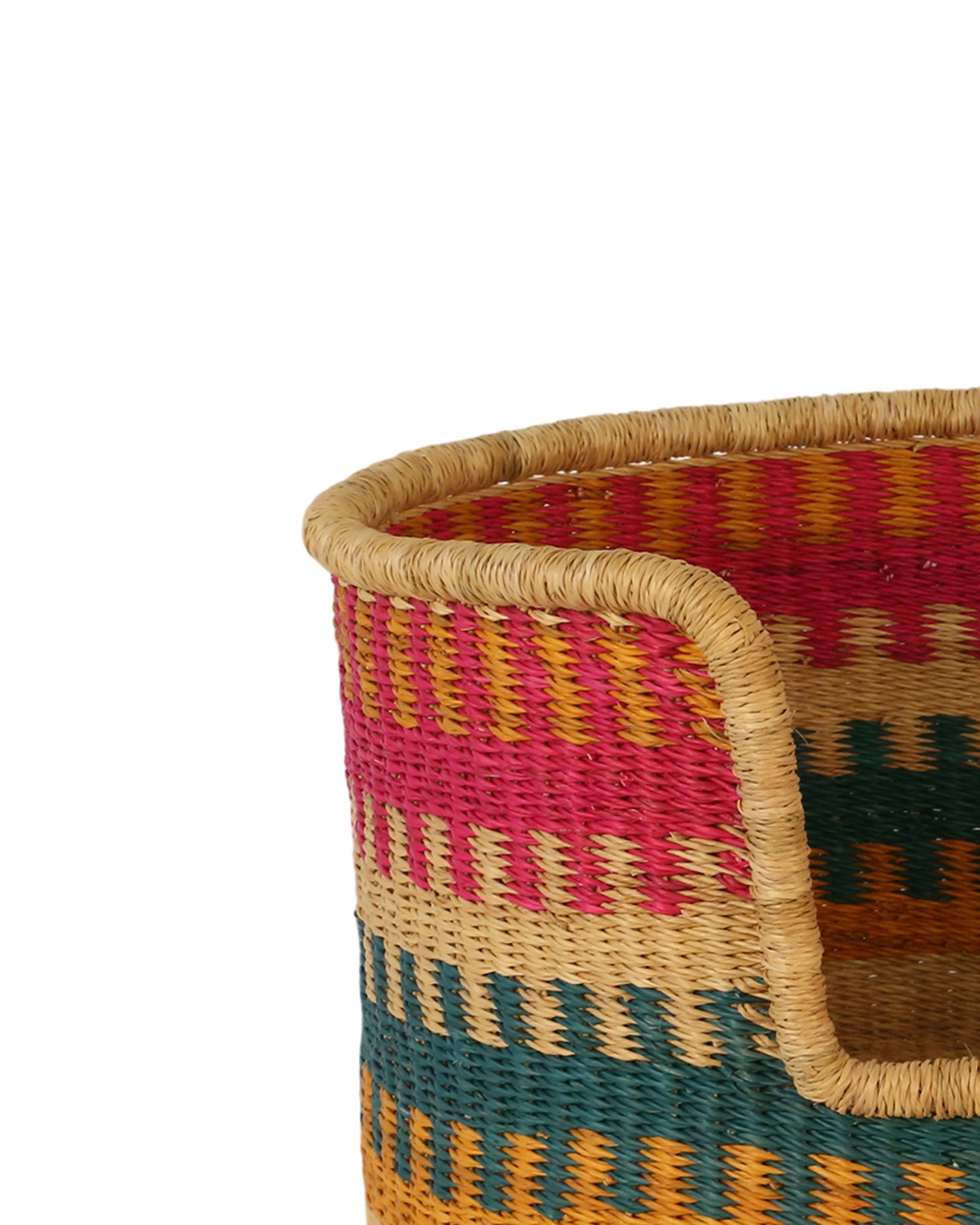 Woven from indigenous veta vera grasses in Northern Ghana - also known as Elephant Grass - each pet basket takes up to three days to weave by hand. The production process is lengthy: this Ghanaian grass is harvested, split, hand-rolled and dyed before a skilled weaver from our partner weaving cooperative in sets to work.