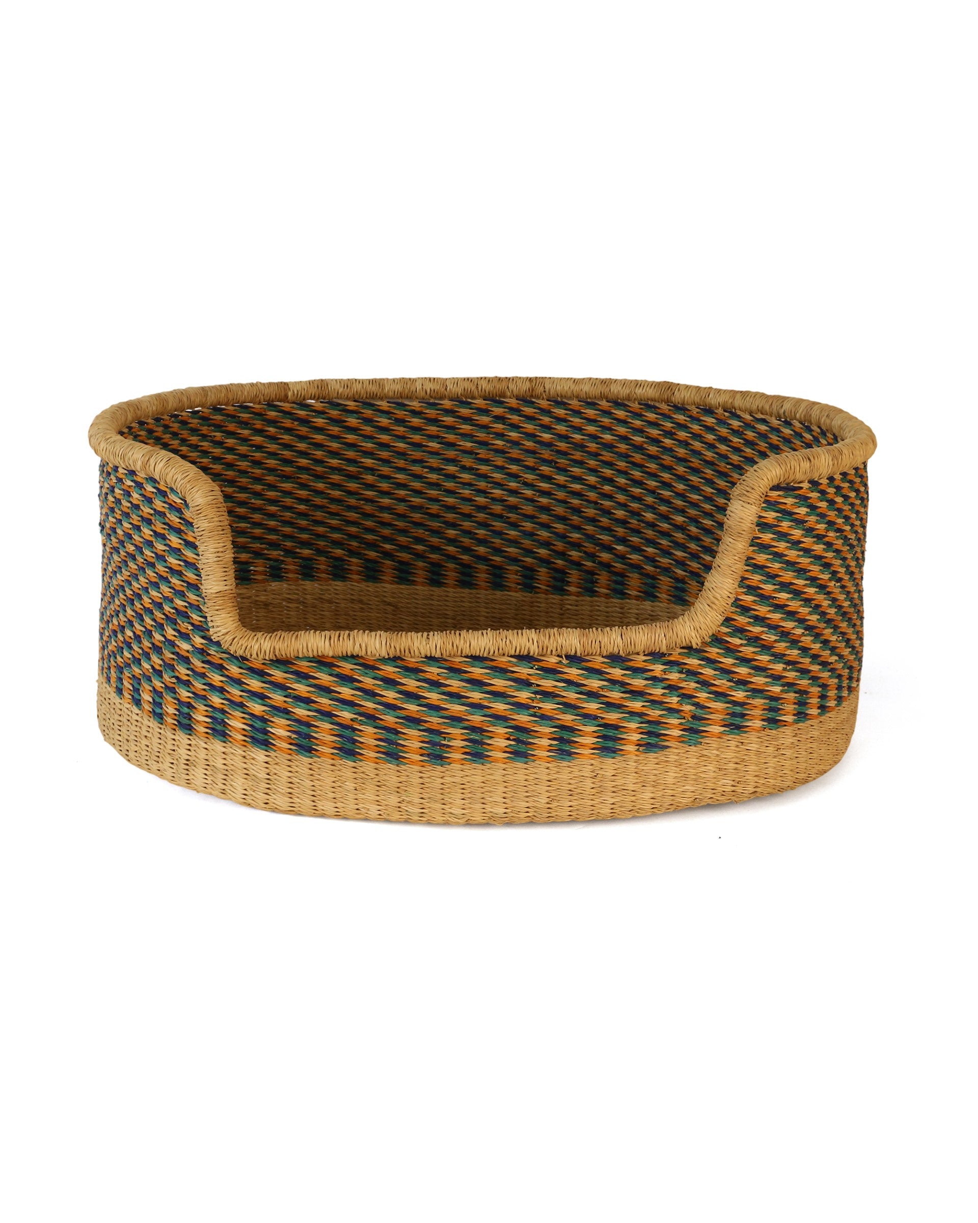 Sporting lovely blue, turquoise and orange stripes against a natural grass base, this beautiful handwoven dog basket will quickly become your medium-sized dog’s favourite place to bed down for the night – or day!