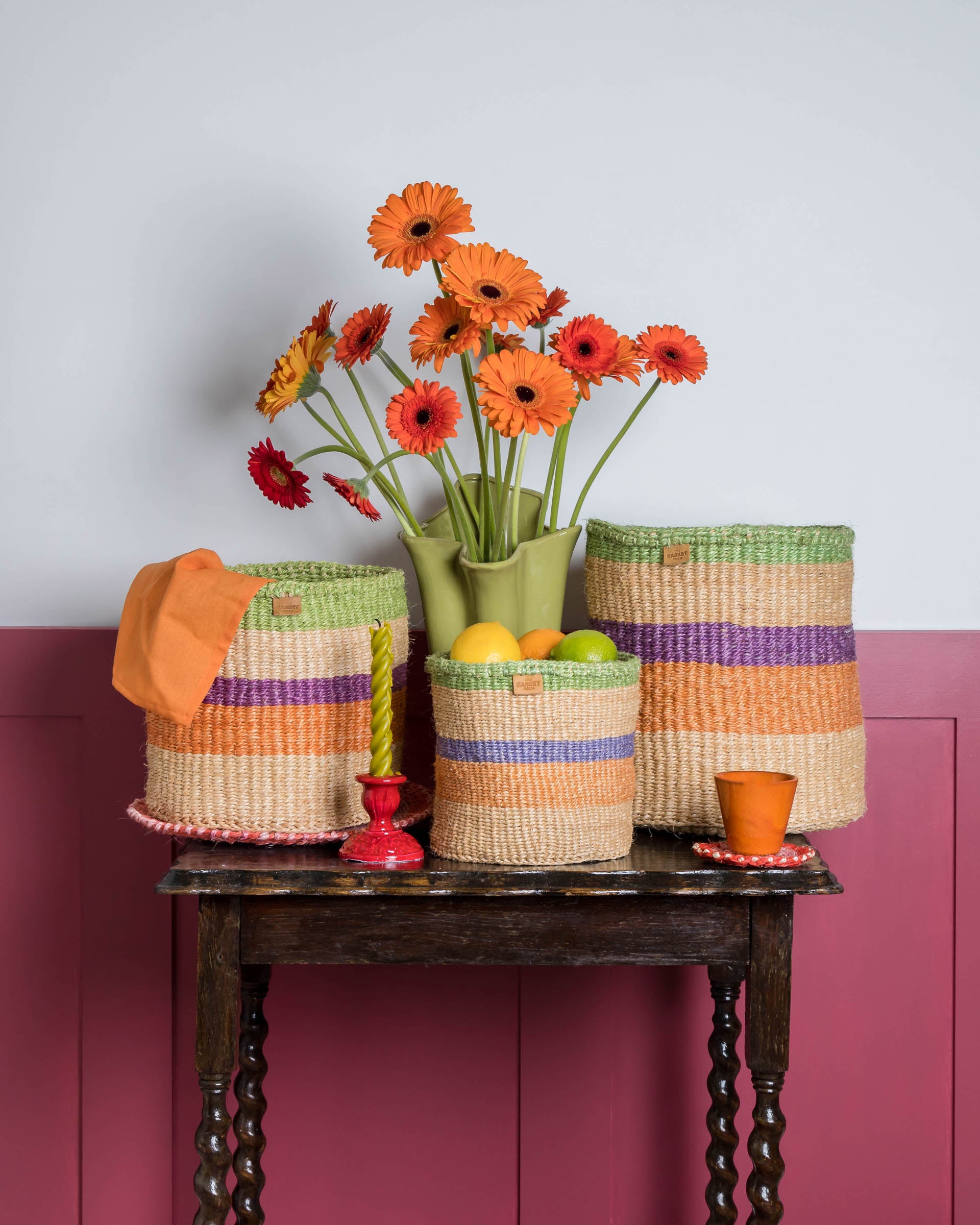 With horizontal stripes of orange, purple, rave green and natural sand, our RELI baskets are a riot of Kenyan colour and craft. Handwoven in three handy sizes, you’ll find one for every home storage need. Use a small woven basket for your make-up and toiletries, jewellery and watches, remote controls, mobile devices and cables, while the medium and large woven baskets make great floor storage for everything from laundry and loo rolls to rugs and blankets, slippers, firewood and children’s toys. These colourful baskets look great on shelves and also make excellent woven planters for all types of houseplants – and we can’t think of a more perfect new home gift.