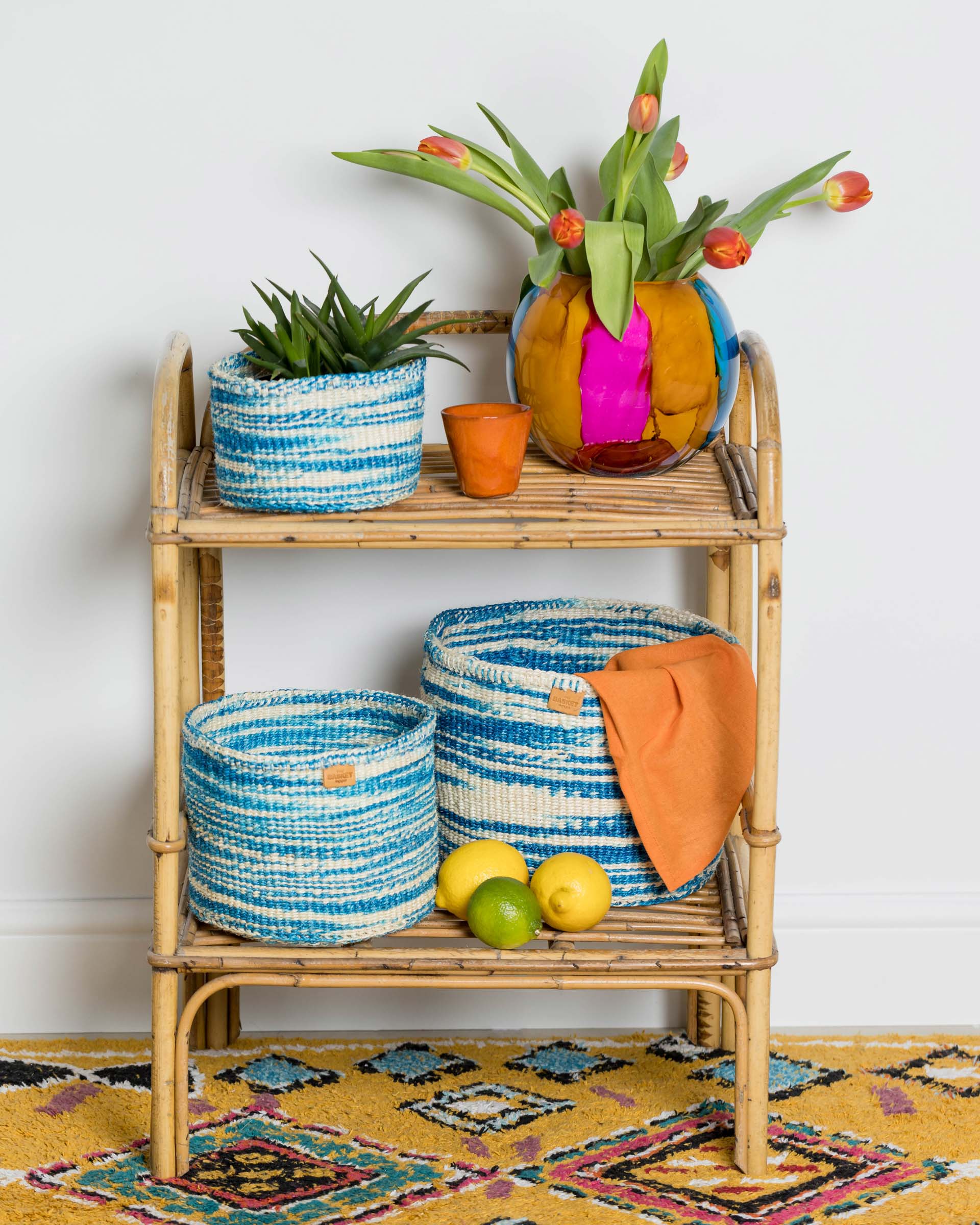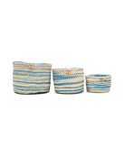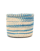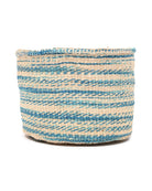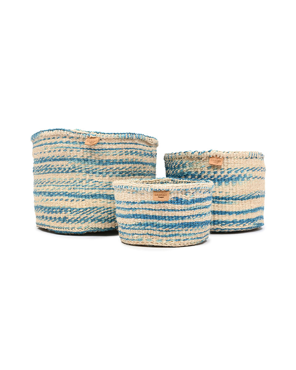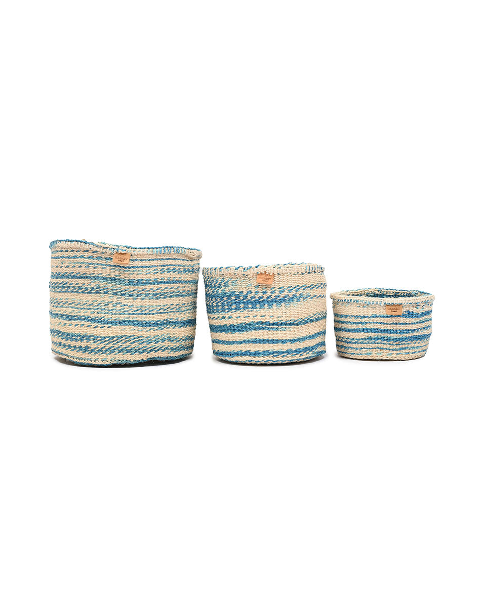 These tie dye pattern baskets feature ribbons of mid blue against a white base, reminiscent of a cloud-streaked Kenyan sky. Produced in three handy sizes and woven from indigenous sisal grass in rural Kenya, these woven storage baskets can be used in many different ways: for keeping your hair accessories and toiletries organized, filled with children’s toys, remote controls and gloves and hats. These round sisal baskets also make beautiful woven planters for your houseplants – and wonderful new home gifts.