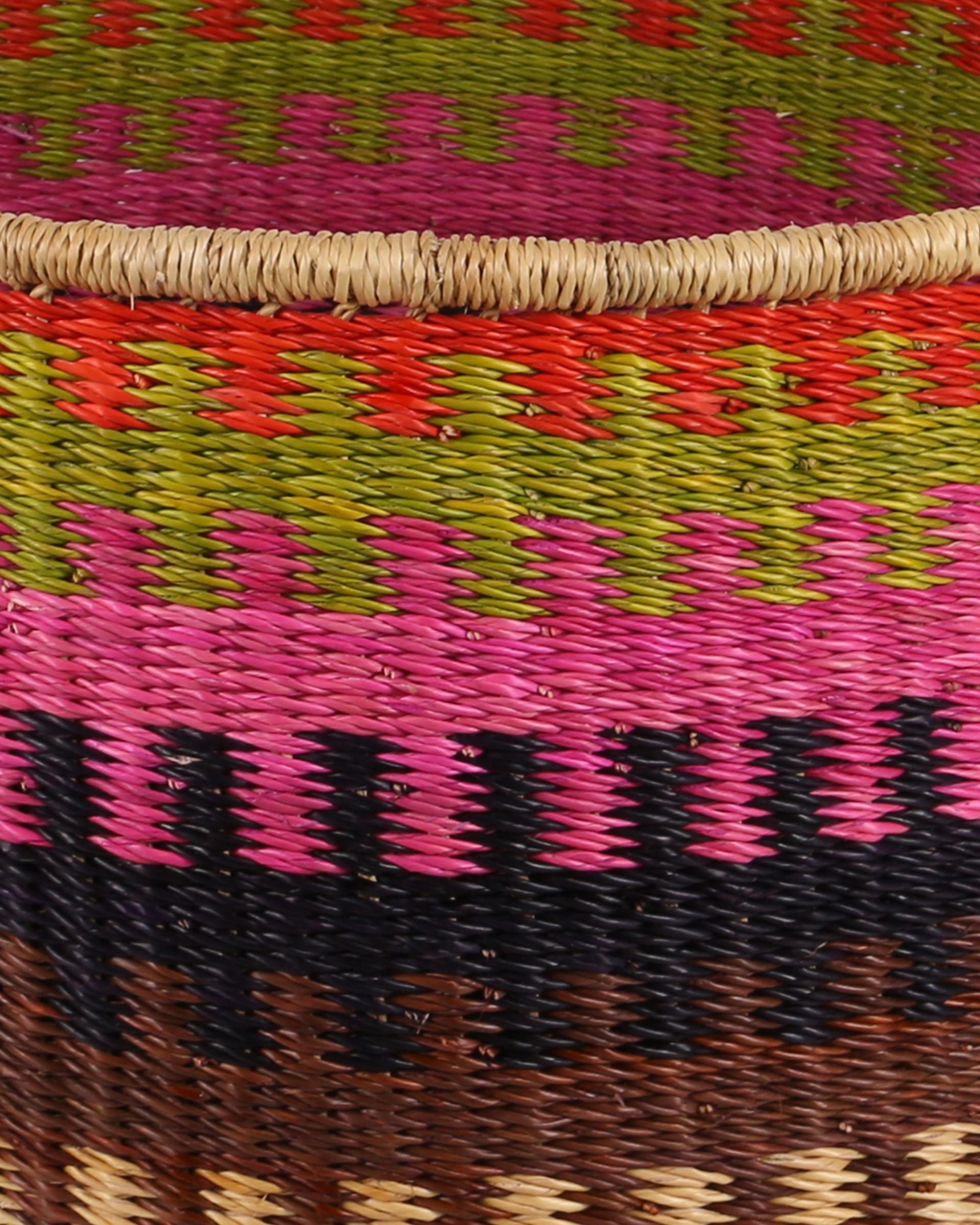Woven from ethically-sourced veta vera grass in Northern Ghana, this colourful basket is made from robust veta vera grass – an indigenous raw material that’s sustainably sourced and perfect for producing durable baskets. The grass is hand-rolled before being woven by a skilled member of our partner weaving cooperative in Northern Ghana.