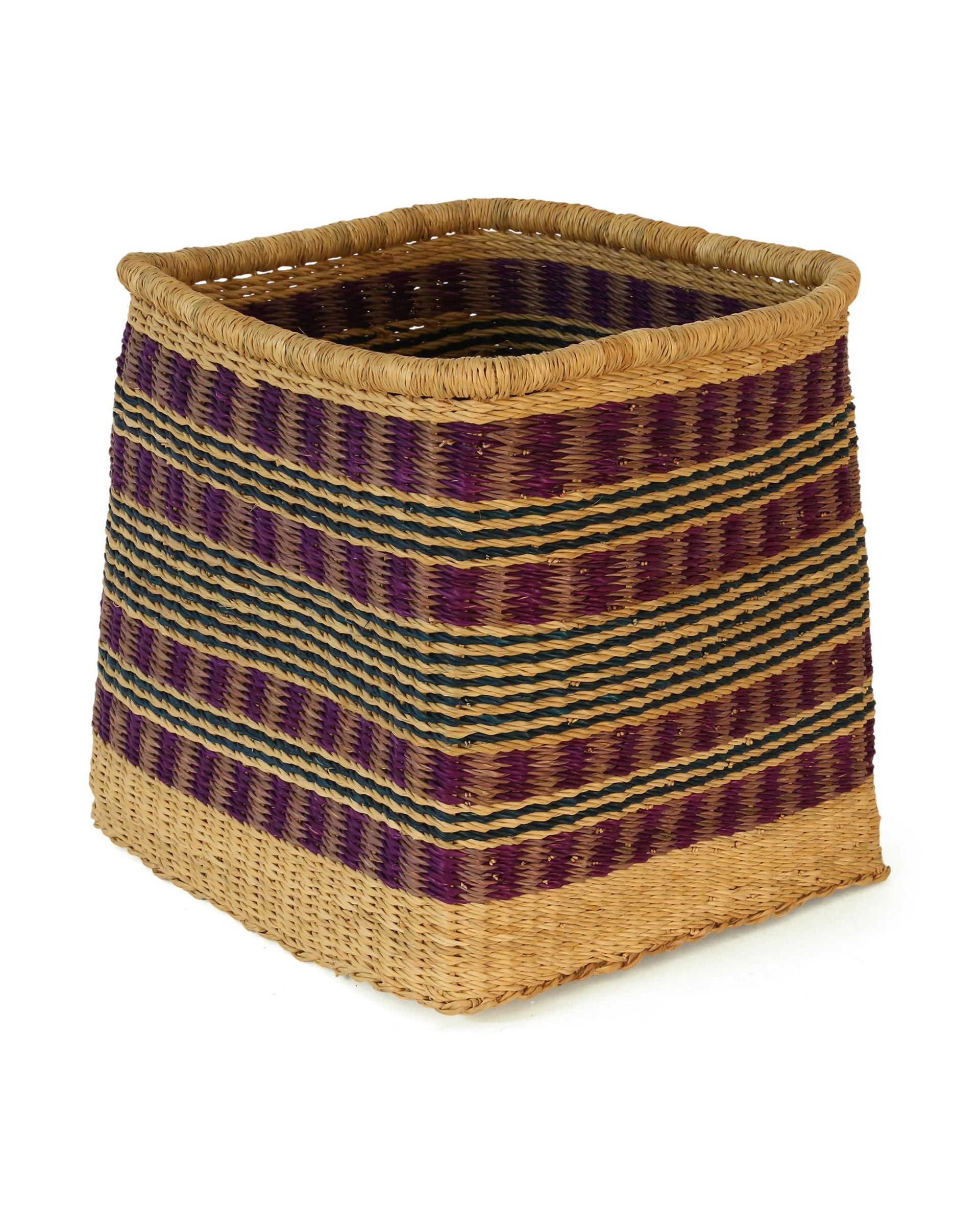 Our smart JACOBKROM square storage baskets sport Purple, Lilac & Teal against a natural undyed grass base. These stylish and robust storage baskets are hand woven in Northern Ghana and look superb all over the home.