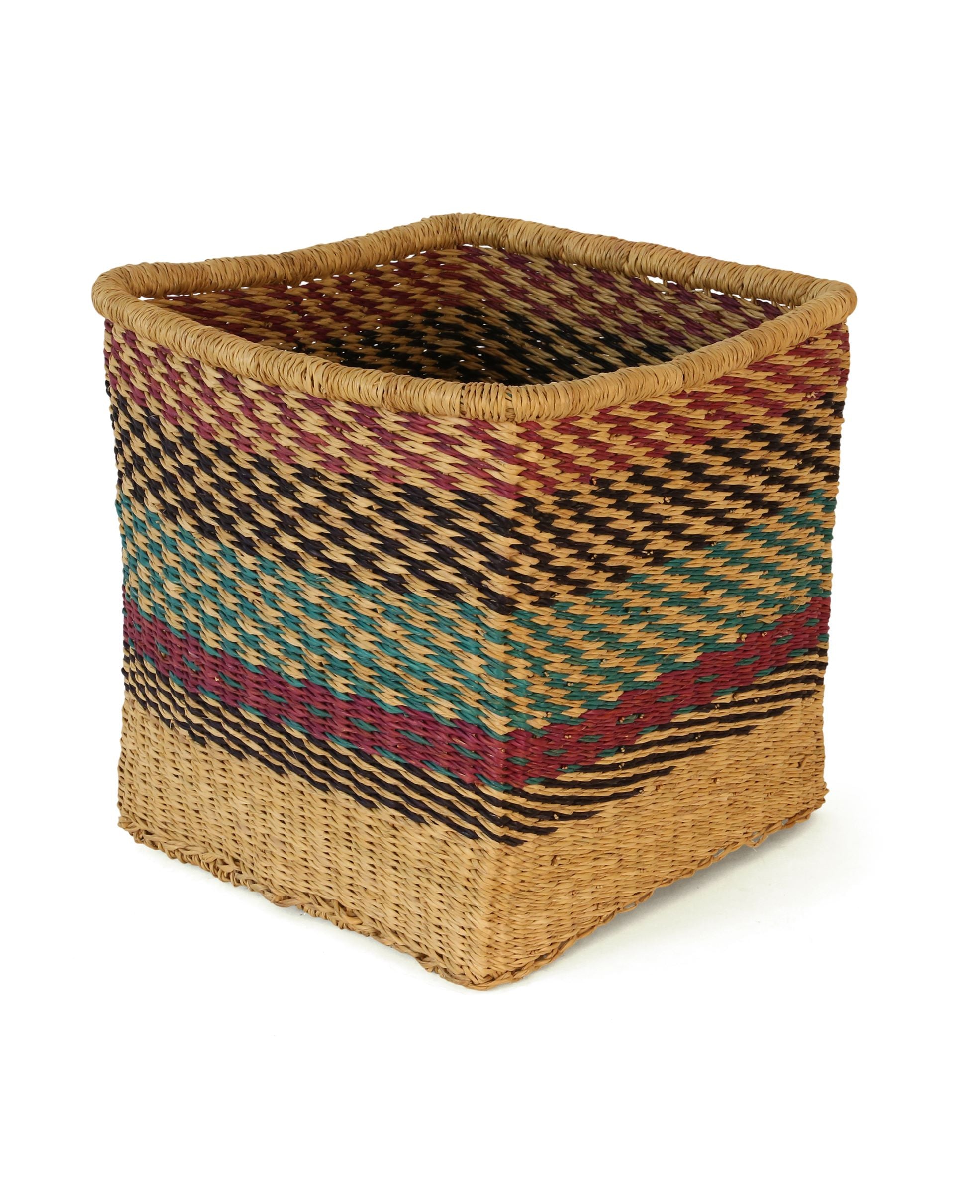 Our smart JIRA square storage baskets sport Purple, Teal & Black against a natural undyed grass base. These stylish and robust storage baskets are hand woven in Northern Ghana and look superb all over the home.