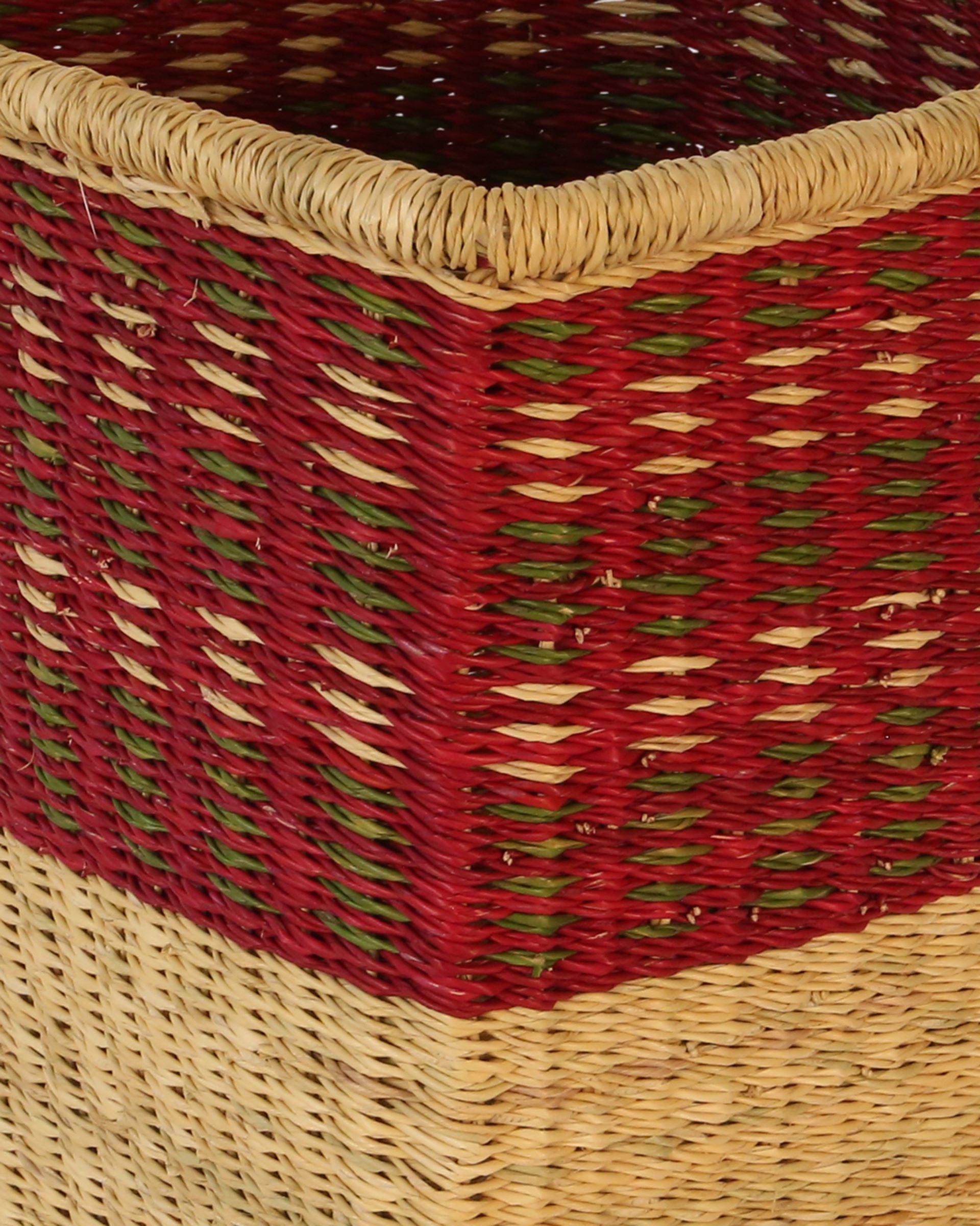 Our smart N KAKANASE square storage baskets sport Burgundy & Khaki against a natural undyed grass base. These stylish and robust storage baskets are hand woven in Northern Ghana and look superb all over the home.