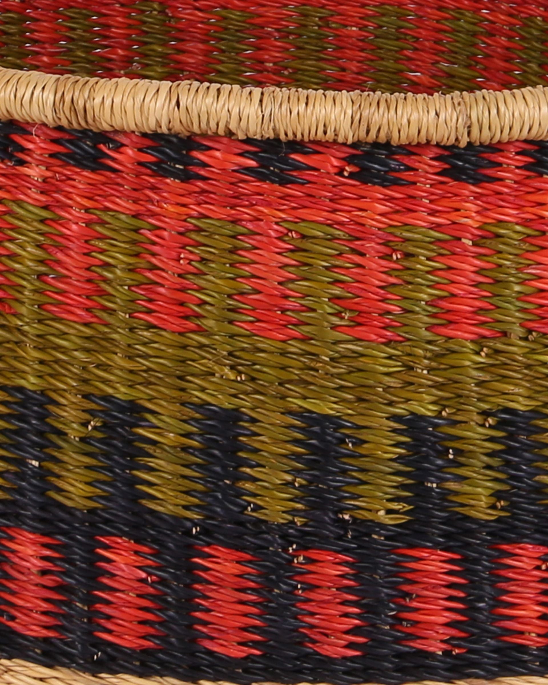 This exquisite KWAMENA hand woven floor basket has been produced in Ghana by a member of a weaving cooperative. Boasting tribal patterns of orange, khaki and black this round storage basket will bring a dash of ethical style to any corner of the home. Fill with blankets, kindling, craft projects or toys – you’ll keep finding new uses for yours! Every small woven basket in this collection is unique – made once and sold once.