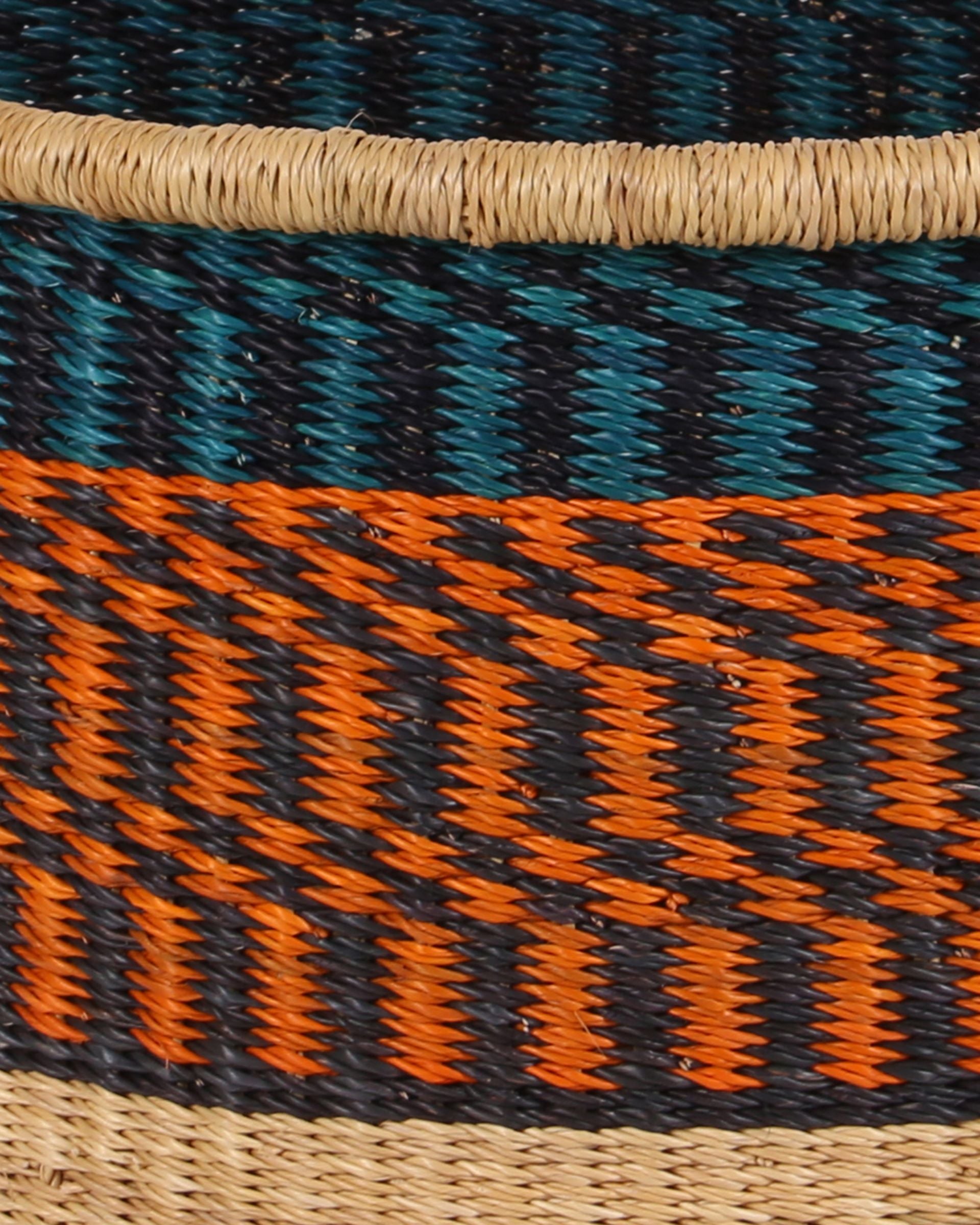 This exquisite MANORGBE hand woven floor basket has been produced in Ghana by a member of a weaving cooperative. Boasting tribal patterns of orange, teal and black this round storage basket will bring a dash of ethical style to any corner of the home. Fill with blankets, kindling, craft projects or toys – you’ll keep finding new uses for yours! Every small woven basket in this collection is unique – made once and sold once.