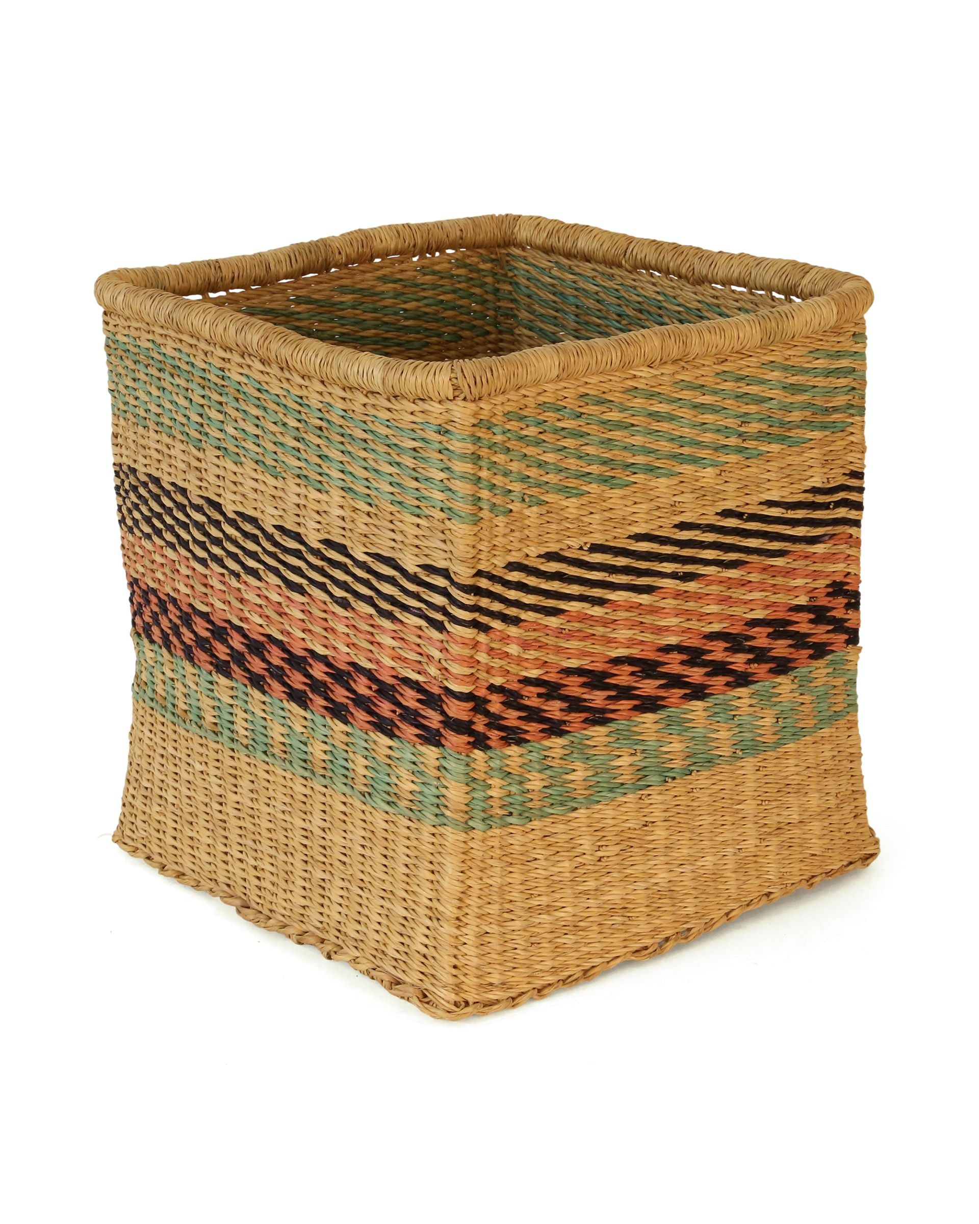 Our smart SIBIRI square storage baskets sport Turquoise, Peach & Black against a natural undyed grass base. These stylish and robust storage baskets are hand woven in Northern Ghana and look superb all over the home.