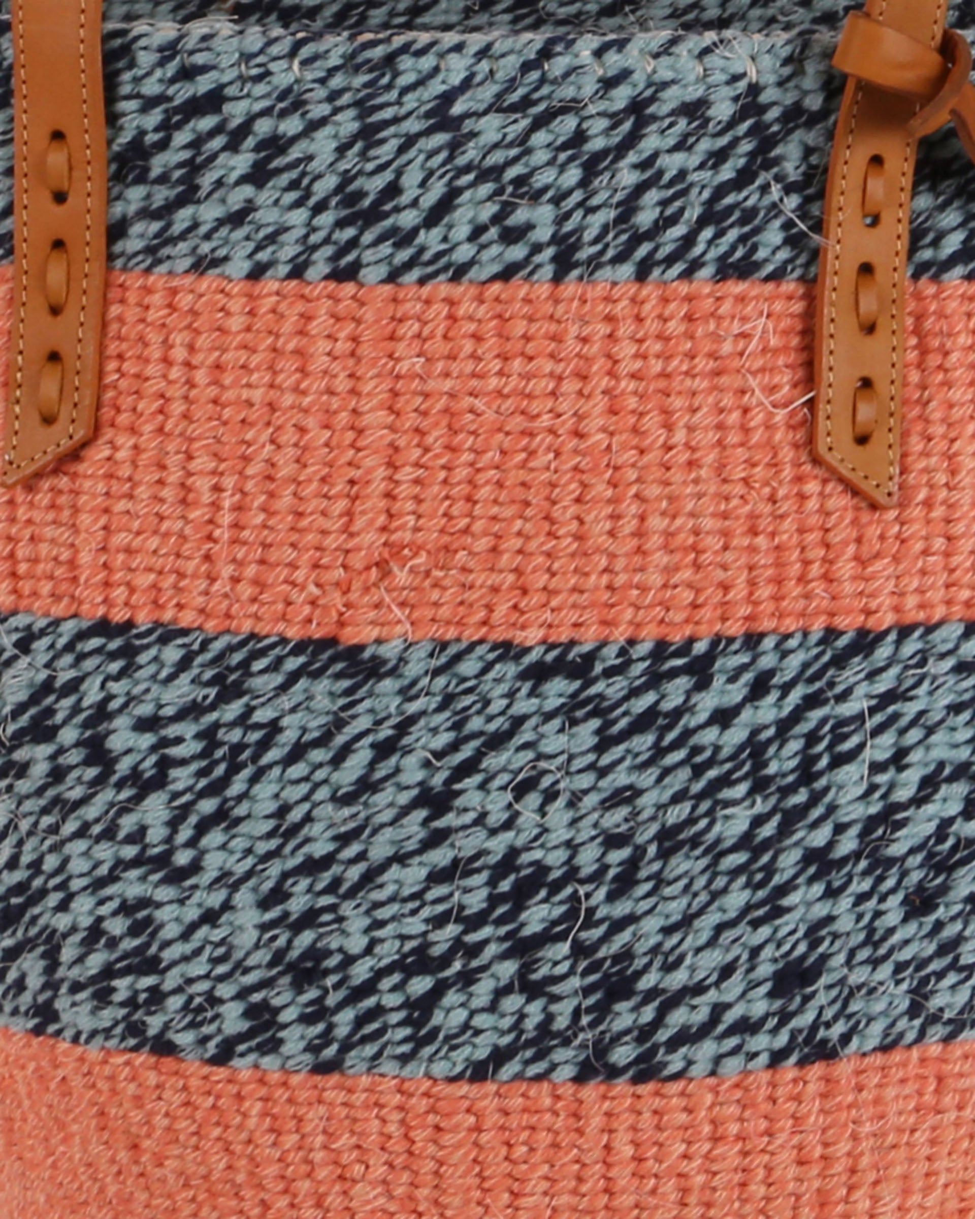 Meet colourful PENZI: a one-of-a-kind Orange, Blue & Black basket bag, made from recycled woolly jumpers. This woven basket bag is a truly Kenyan celebration of sustainable style. We are proud to partner with women working within several weaving cooperatives in Eastern Kenya and Nairobi to produce these baskets.
