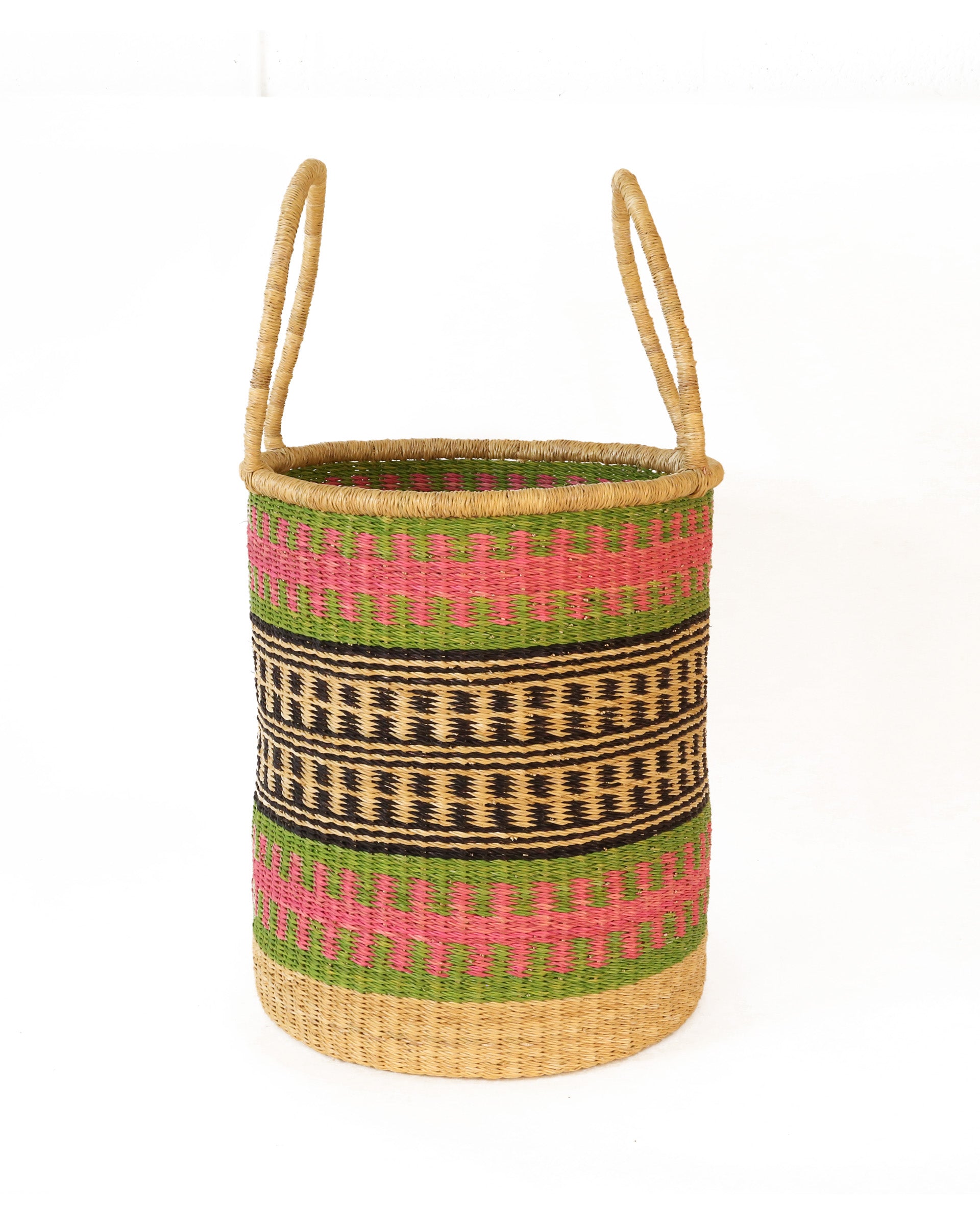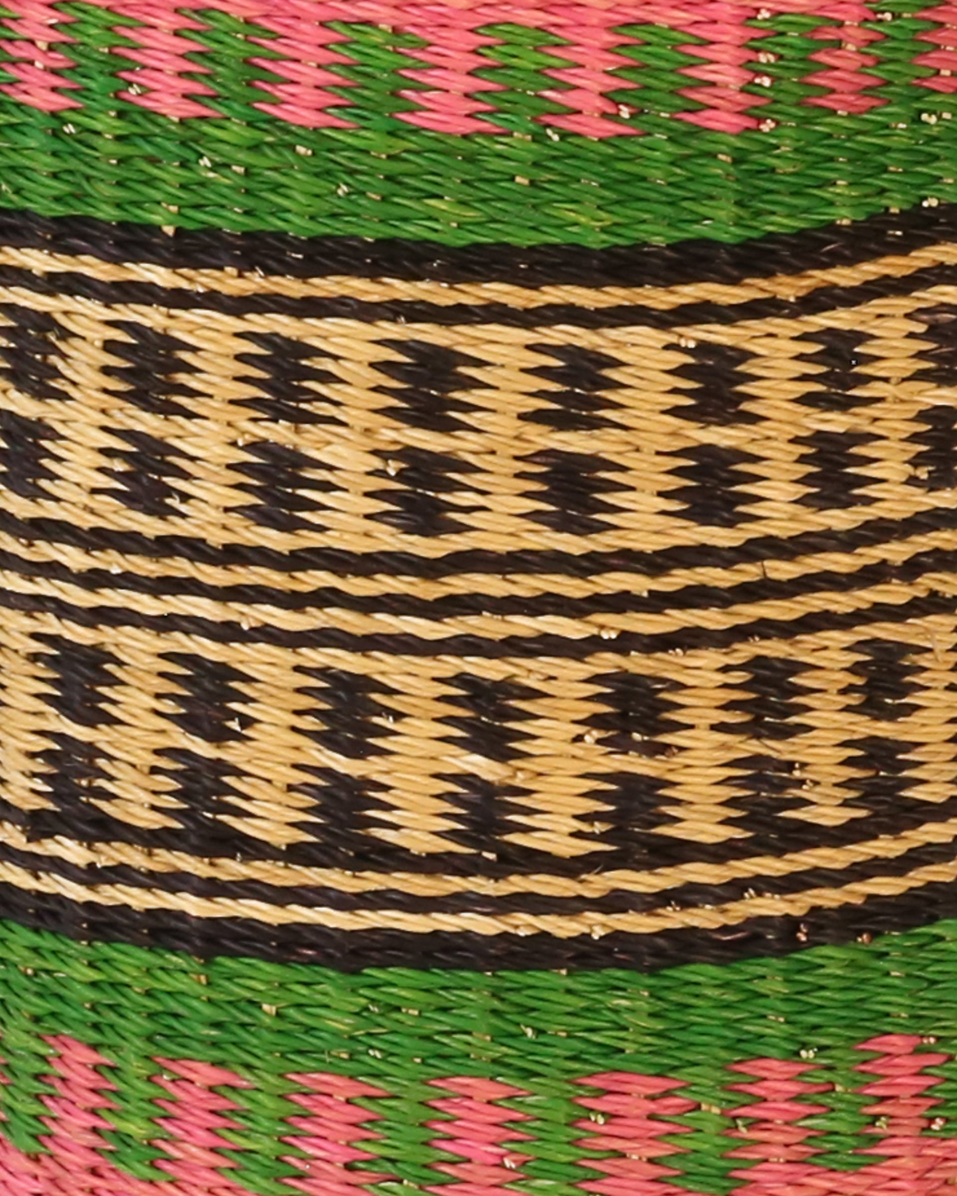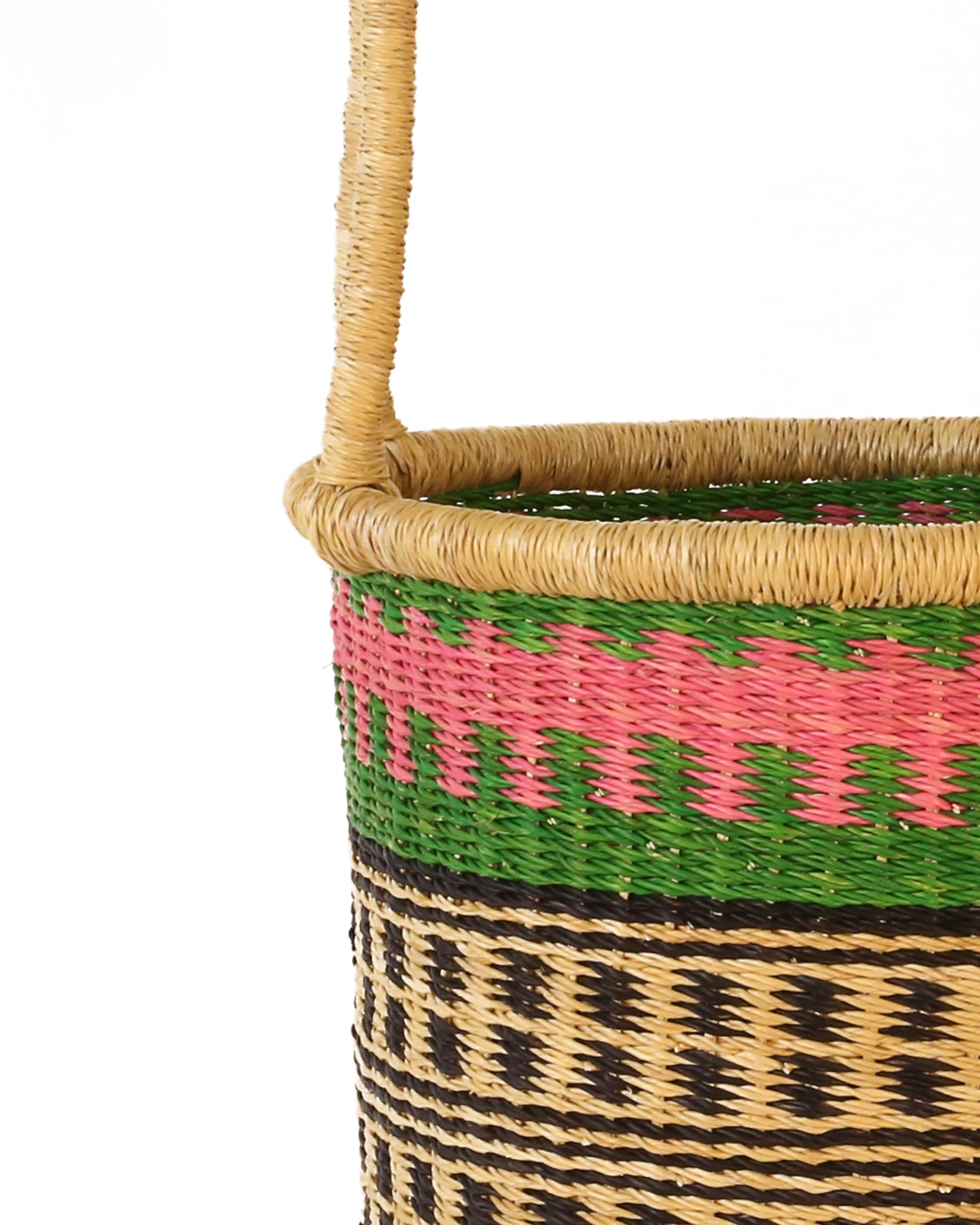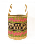 Declutter and bring a splash of Ghanaian colour to your home with the ABRABA log basket, in sizes small, medium and large. With tribal-inspired patterns in pink, green and black, these tall baskets are perfect for storing kindling and logs by the fireside and are useful all over the home – as a laundry basket, toy basket, or blanket basket – the possibilities are endless! Every log basket in this collection is totally unique – made once and sold once.