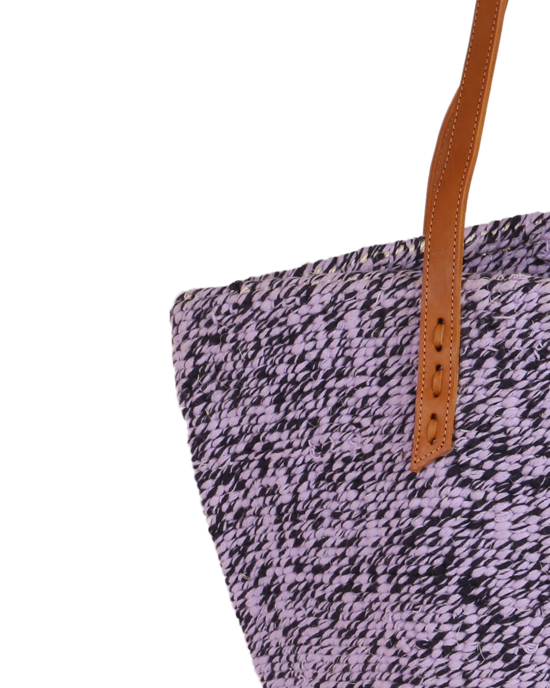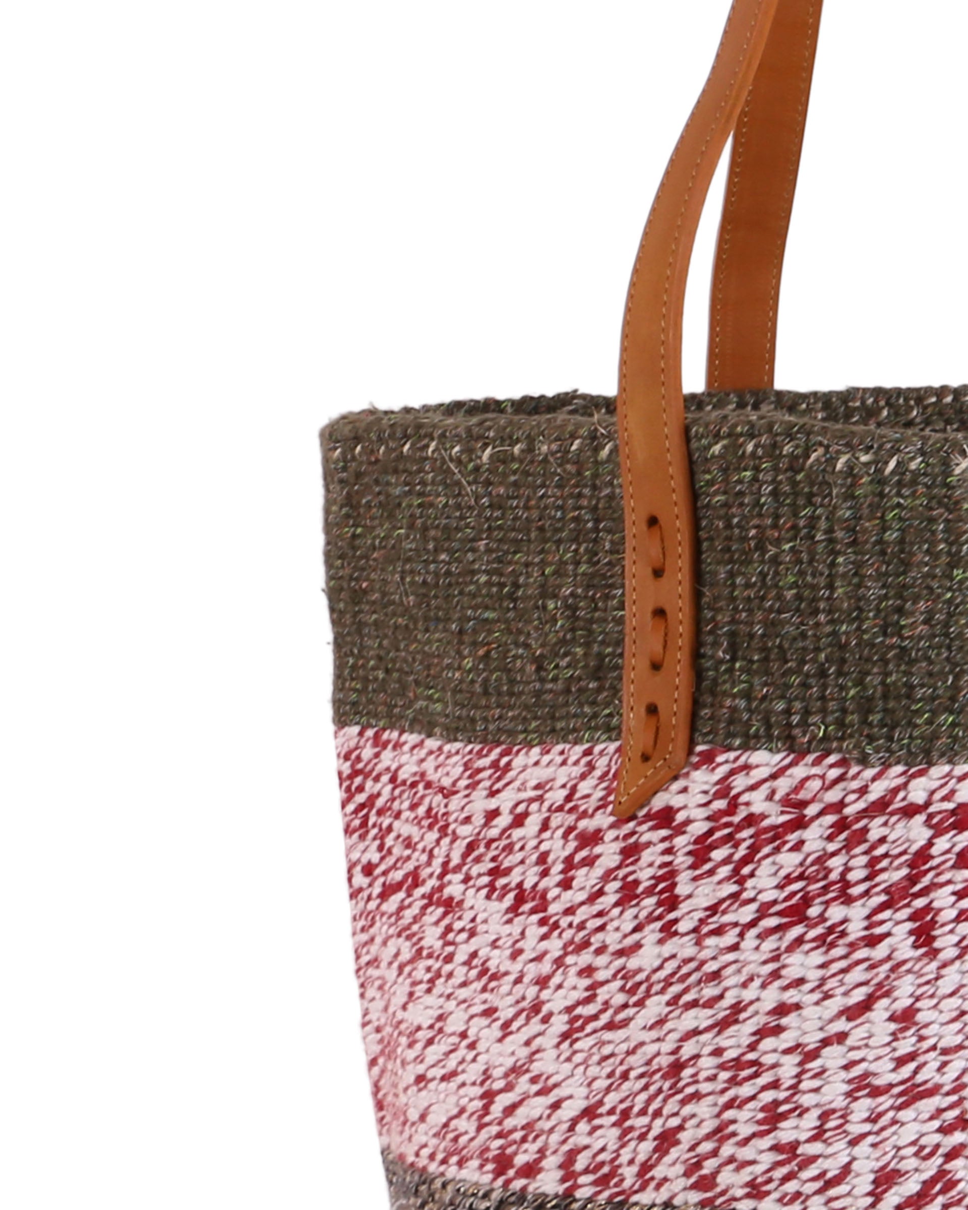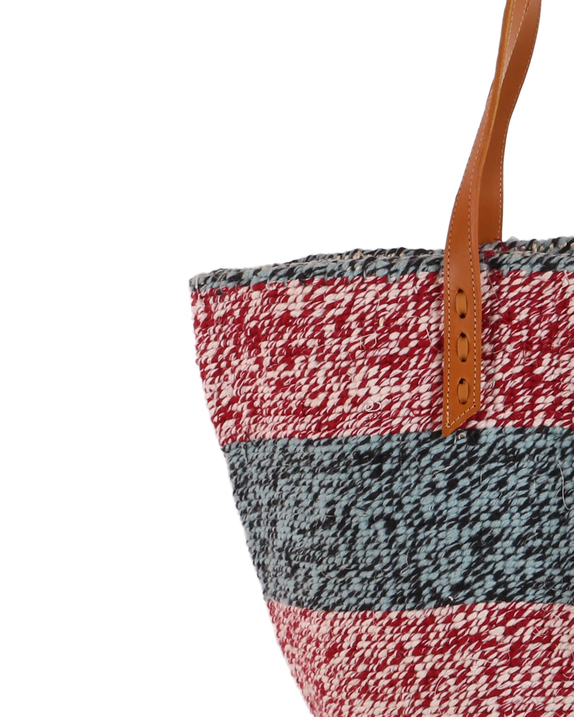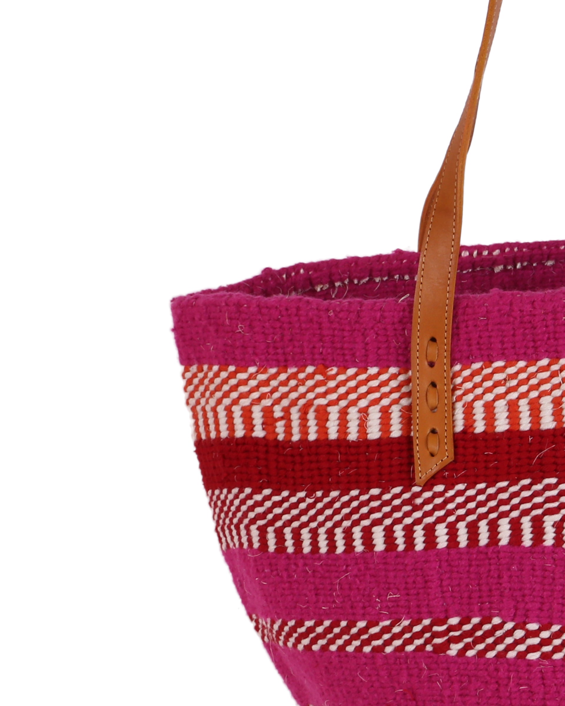 These basket bags are made from wool from second hand jumpers, woven around local sisal grass. The weavers regularly visit the ‘gikombas’ (clothes markets) to select and purchase colourful woollen jumpers, which are washed and unravelled at home into separate balls of coloured wool – and then woven. The bags are finished in a local leather works, being fitted supple cow hide straps for carrying.