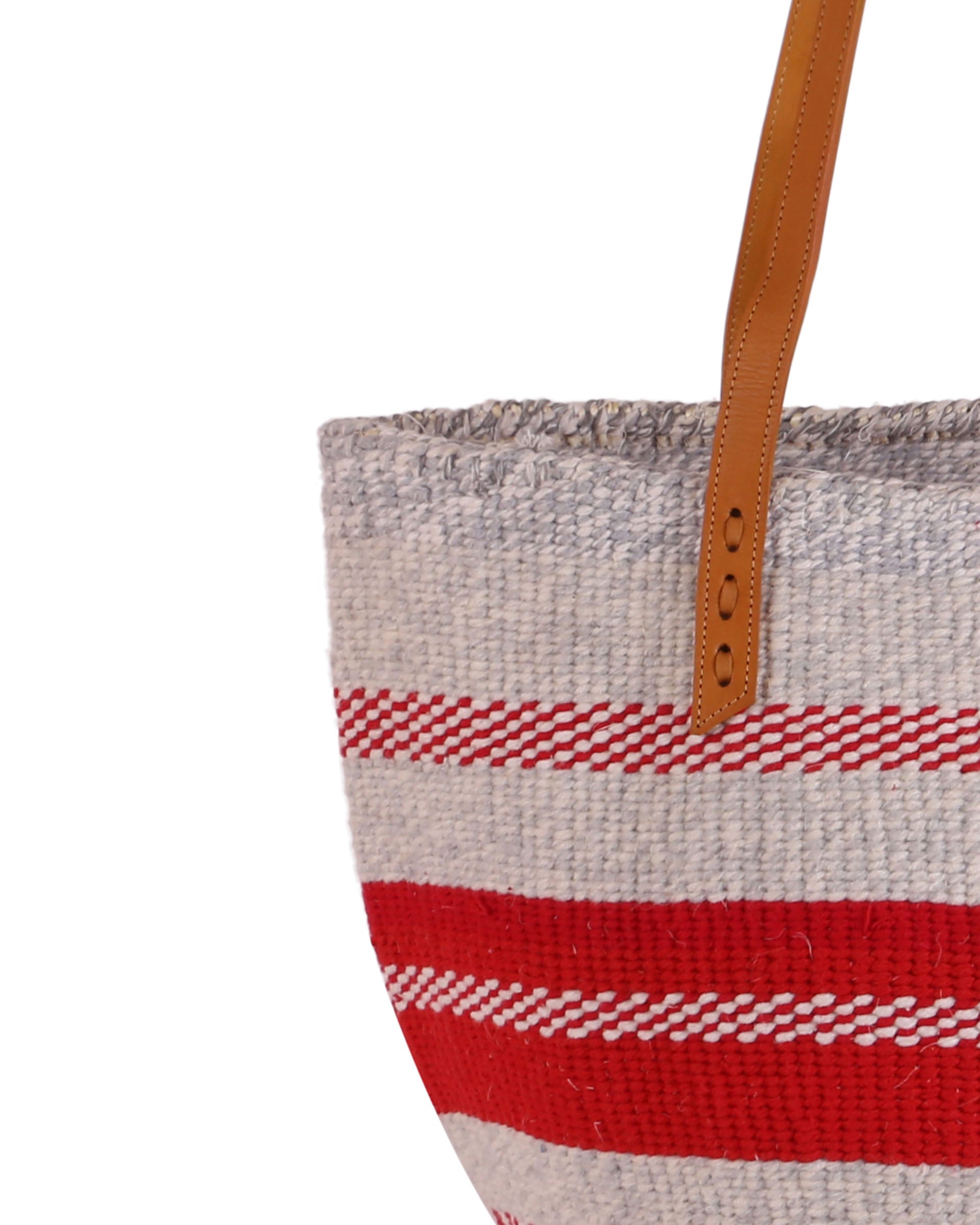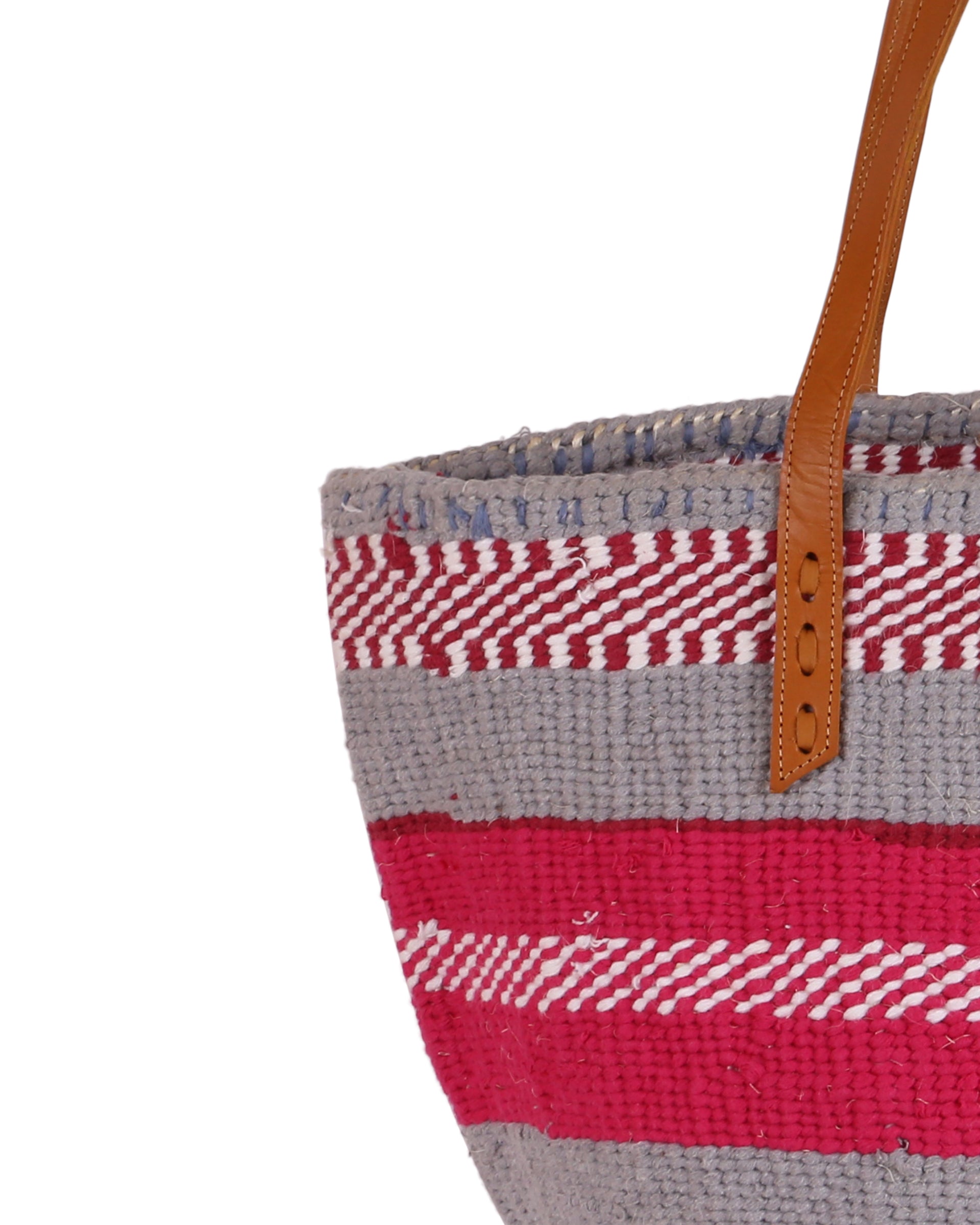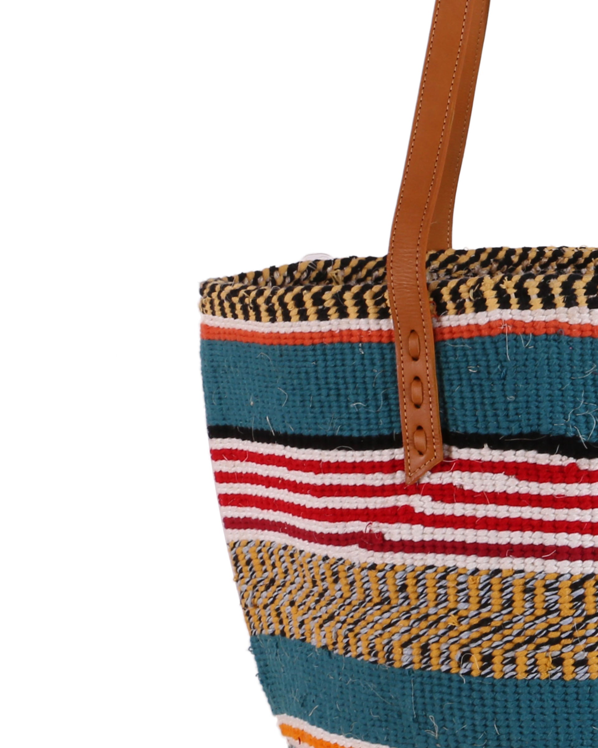 These basket bags are made from wool from second hand jumpers, woven around local sisal grass. The weavers regularly visit the ‘gikombas’ (clothes markets) to select and purchase colourful woollen jumpers, which are washed and unravelled at home into separate balls of coloured wool – and then woven. The bags are finished in a local leather works, being fitted supple cow hide straps for carrying.