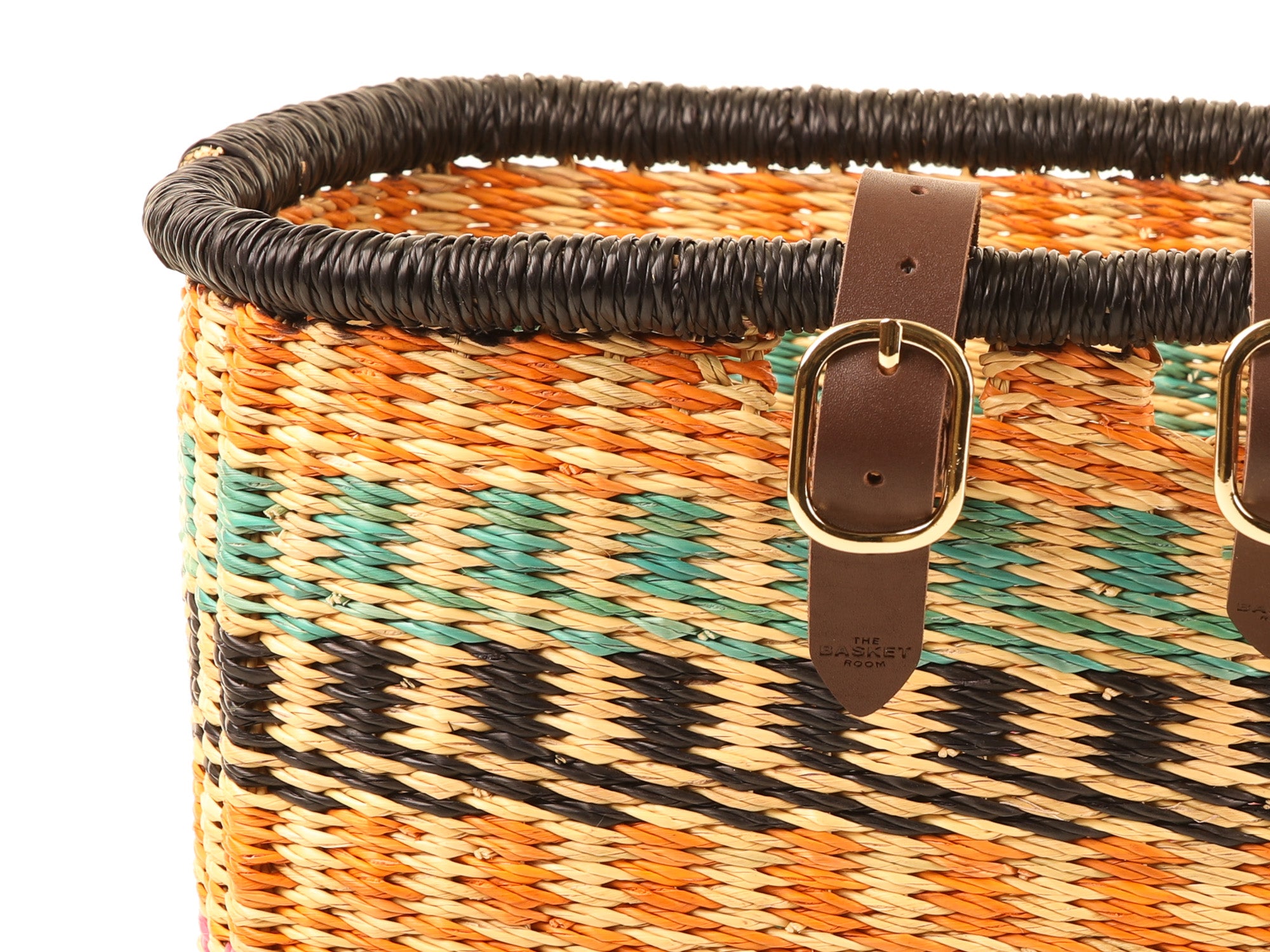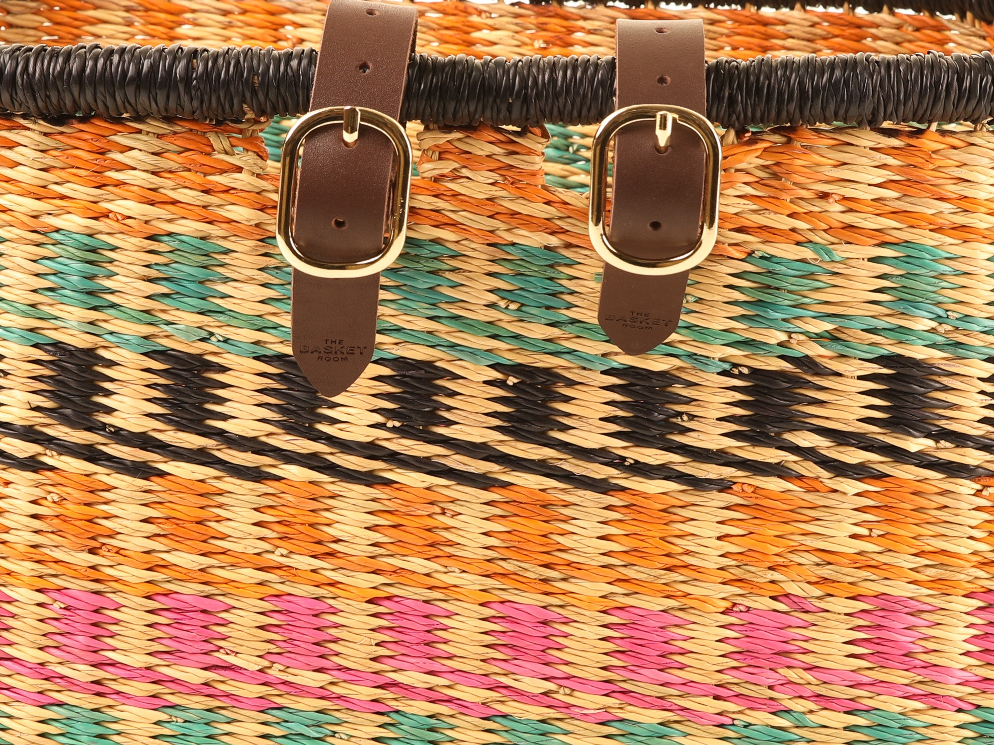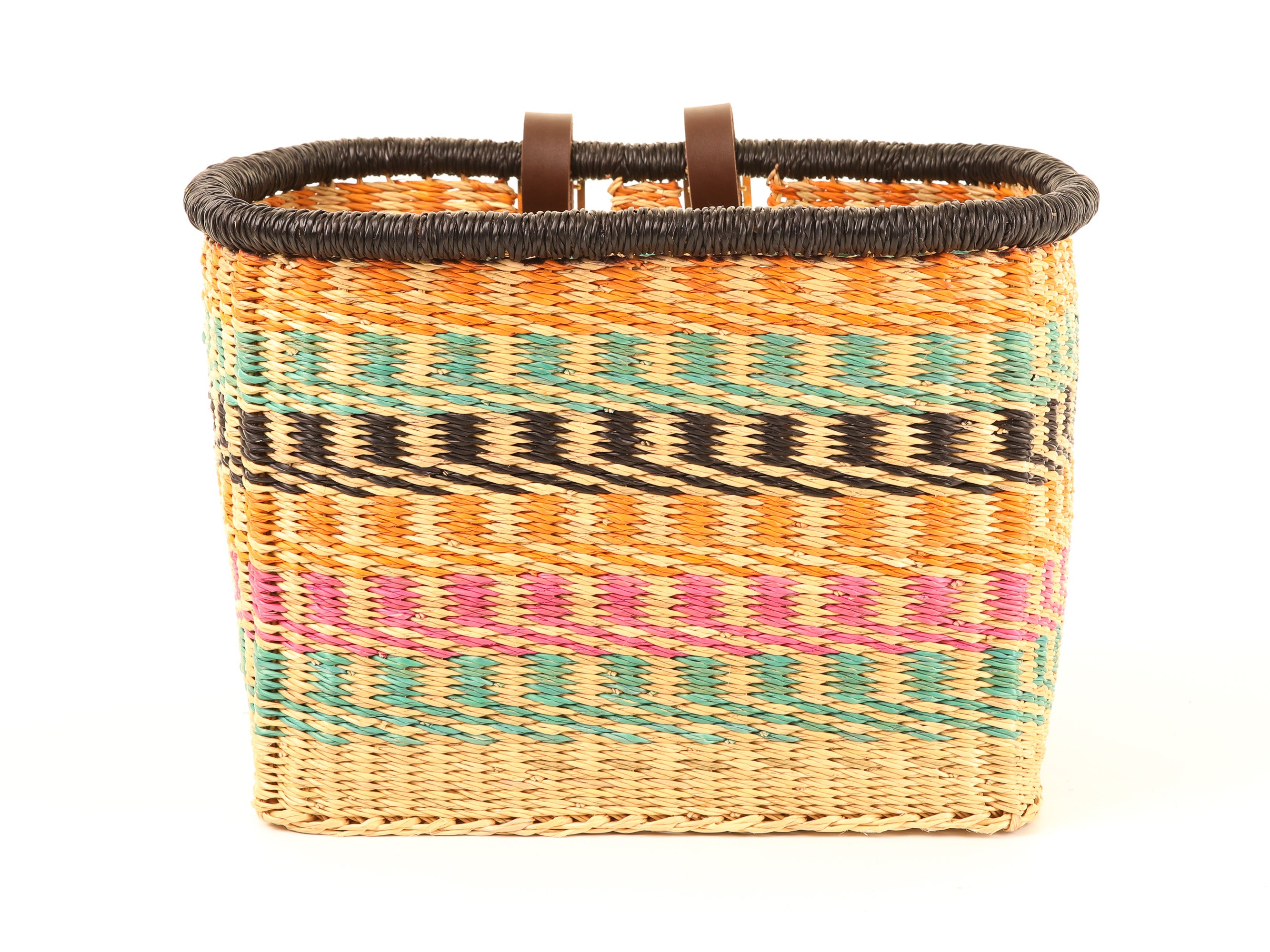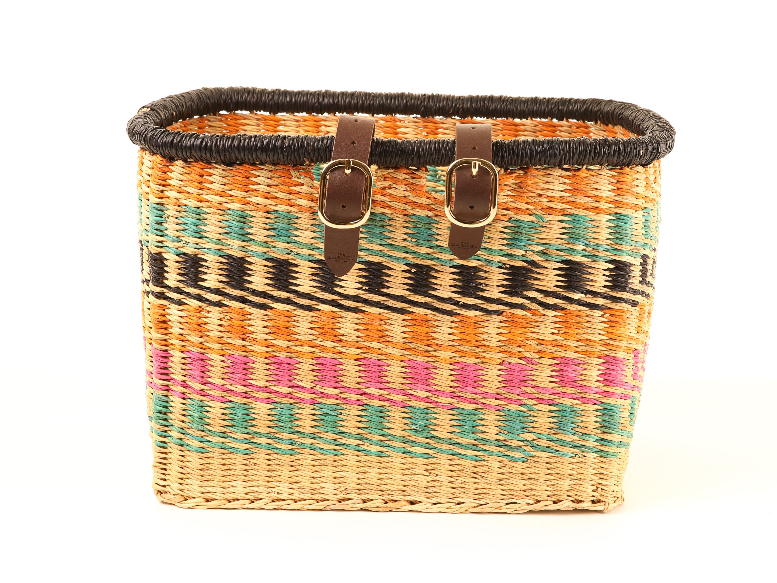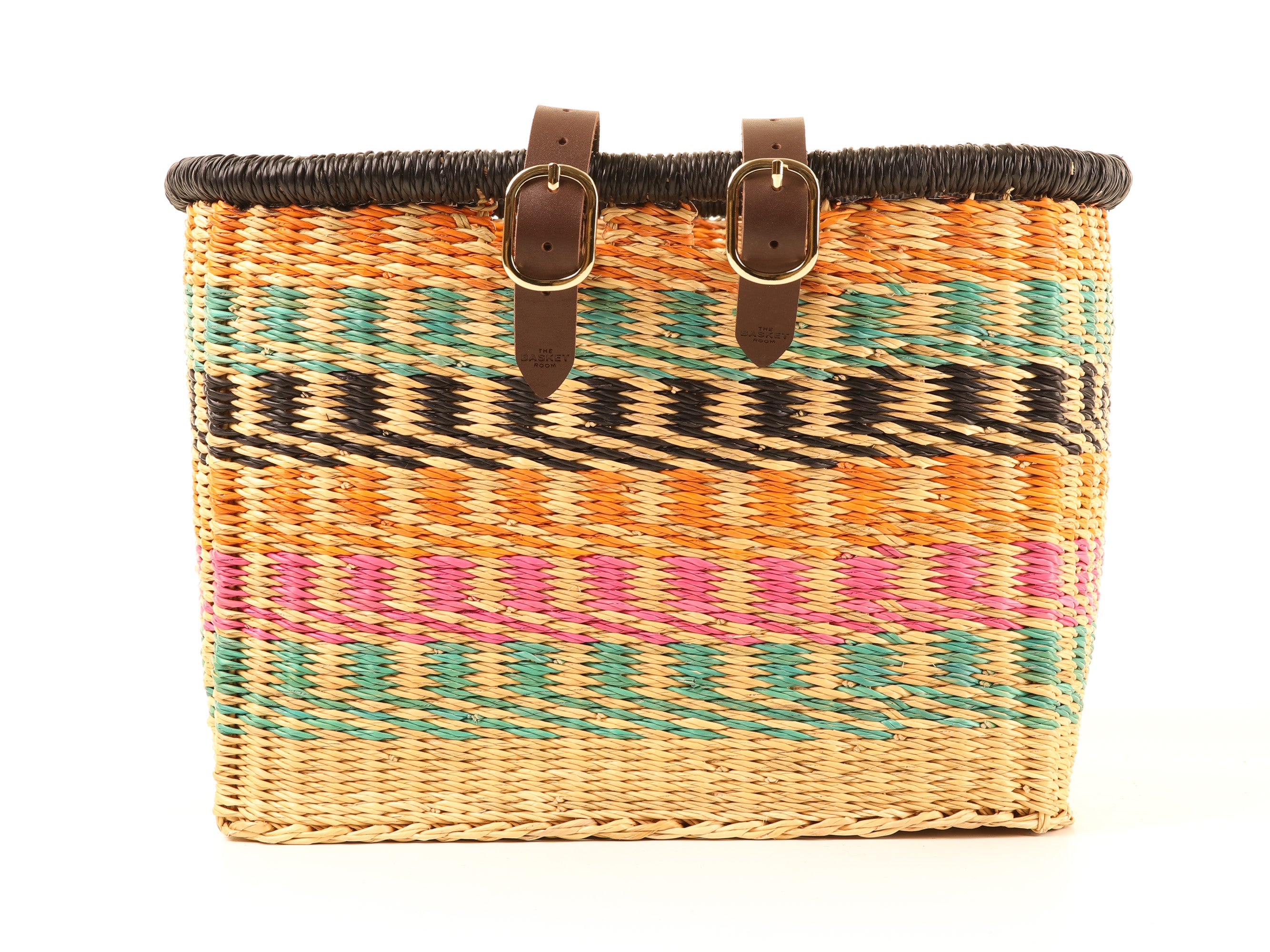 Meet ASHANTI: a stunning hand woven bicycle basket with bright Ghanaian flashes of pink, black, orange, red and turquoise. This rectangular front basket is a most unique bike accessory, designed in-house by The Basket Room.