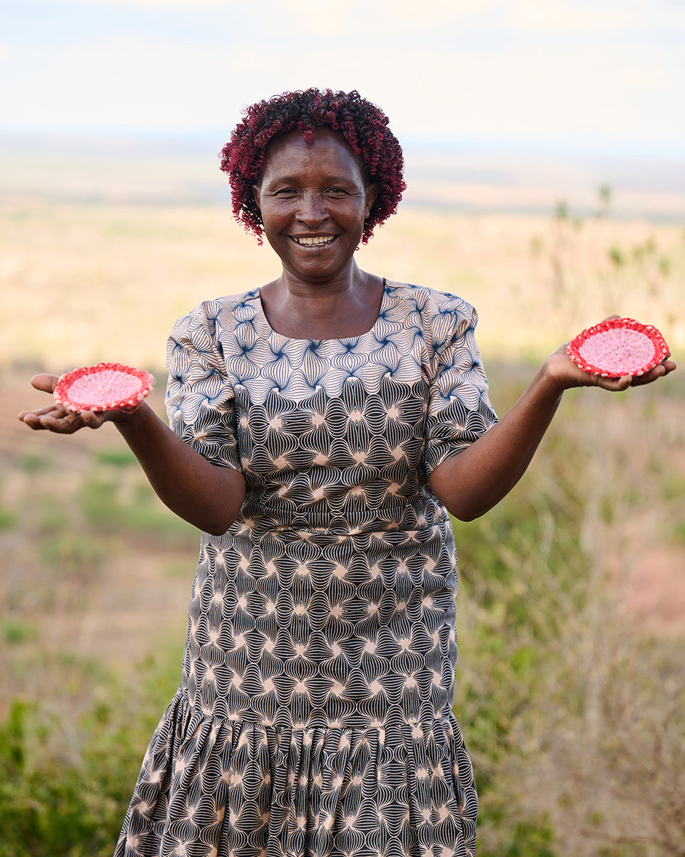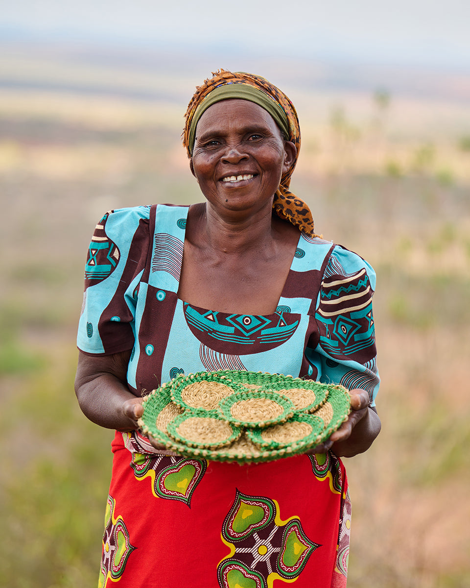 The craftswomen behind these round place mats all learned to weave from their mothers and grandmothers, and practise this traditional craft within a small weaving group in rural Kenya. We visit these women as often as we can, and have built a strong bond with the weavers and their chairlady, Madam Dorcas over the years. Where once these weavers would undertake the long journey to Nairobi to sell their work at markets, The Basket Room now places regular orders with them, enabling these women to work sustainably from home.