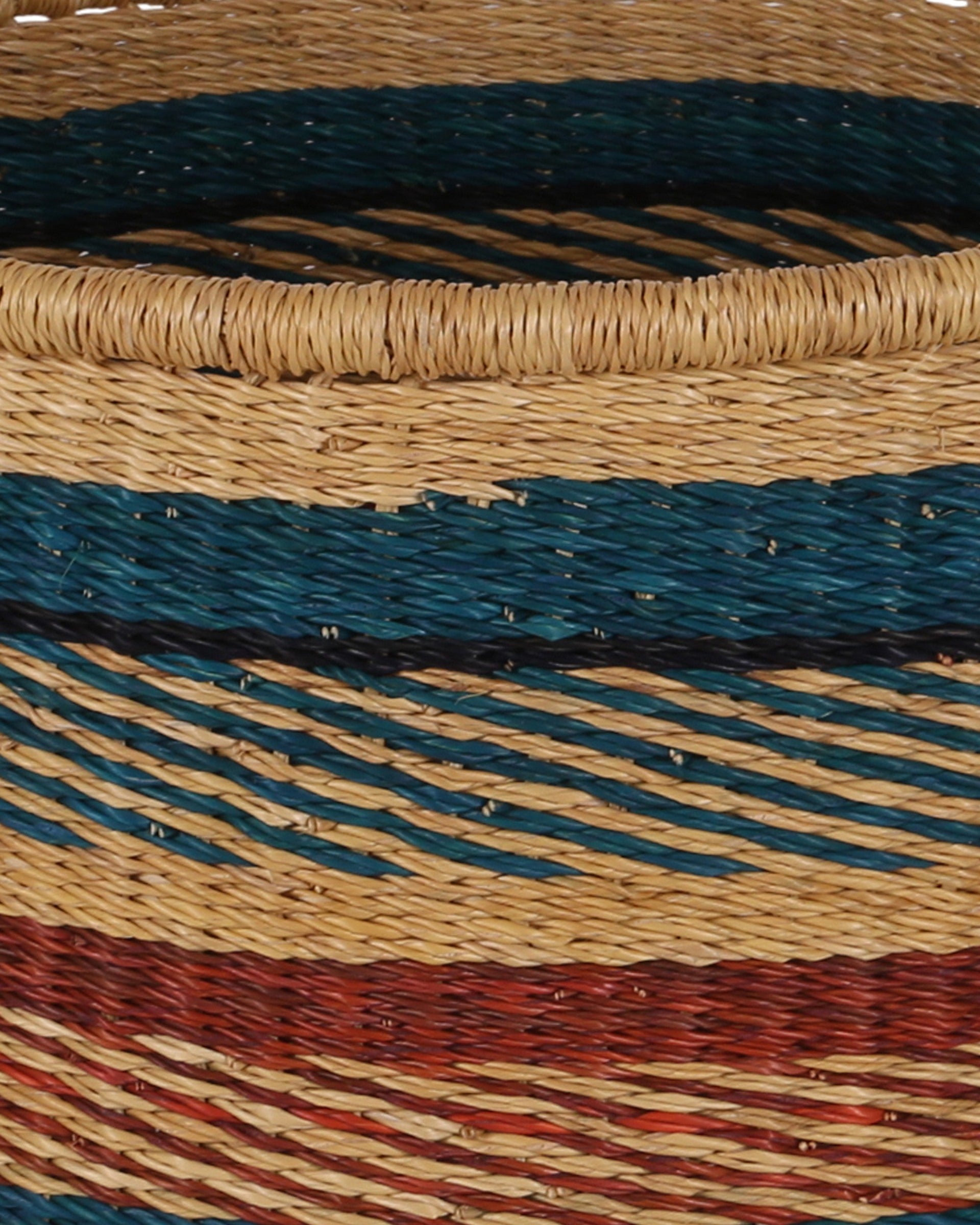 This exquisite AFRIYE hand woven floor basket has been produced in Ghana by a member of a weaving cooperative. Boasting tribal patterns of teal, brown and black this round storage basket will bring a dash of ethical style to any corner of the home. Fill with blankets, kindling, craft projects or toys – you’ll keep finding new uses for yours! Every small woven basket in this collection is unique – made once and sold once.