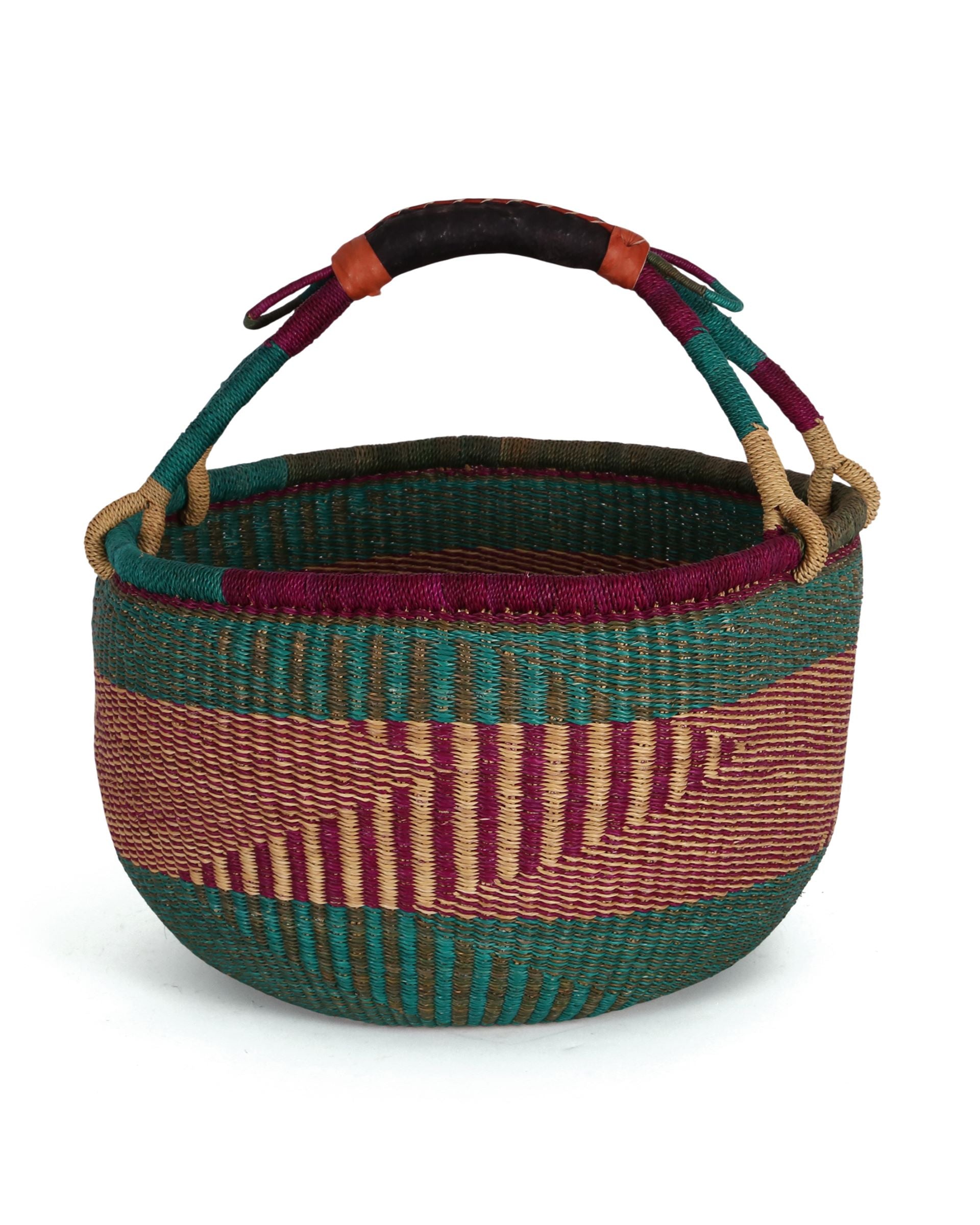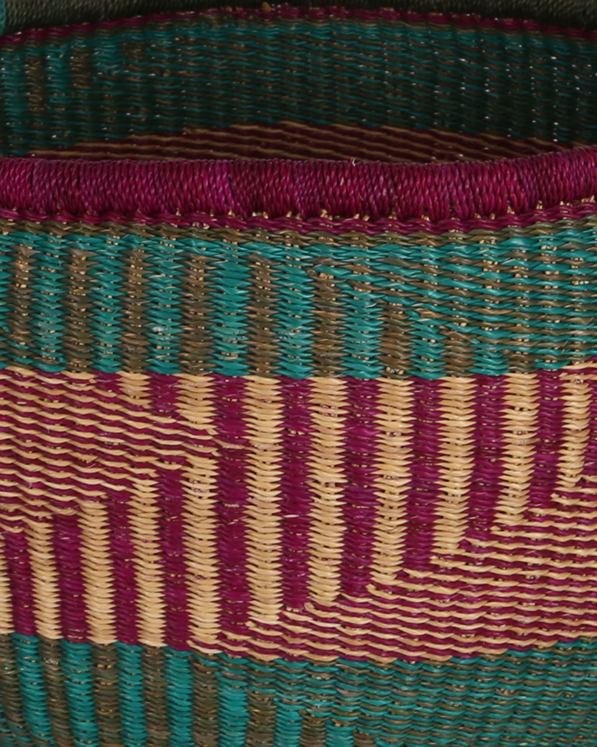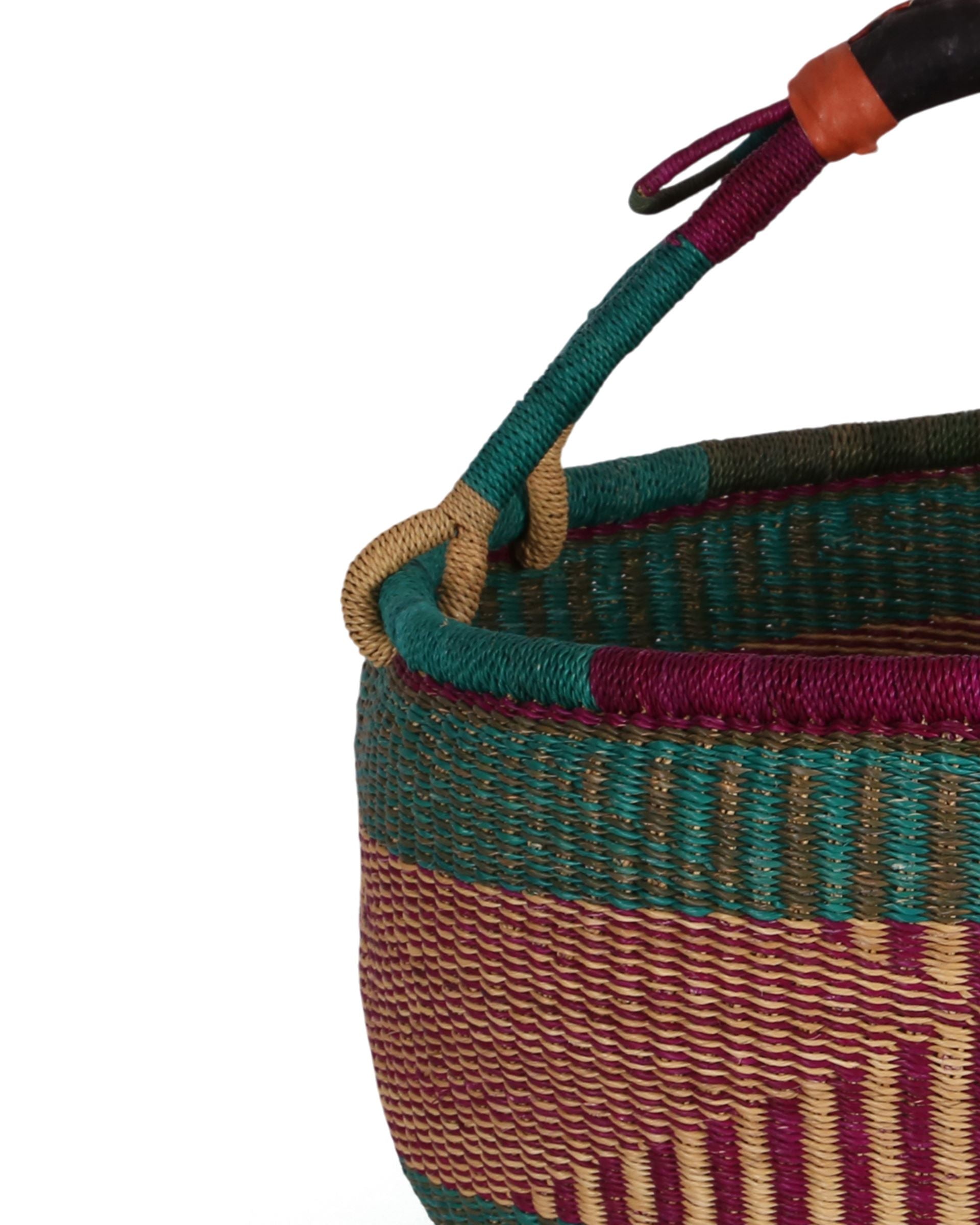 BONA is a hand woven market basket produced in the traditional Ghanaian bolga basket style. With tribal patterns in Purple, Blue & Green this basket is perfect for market trips or picnics, but can also be put to use all over the home – as a laundry basket, toy basket, vegetable basket, blanket basket – the possibilities are endless! Every market basket in this collection is totally unique – made once and sold once.
