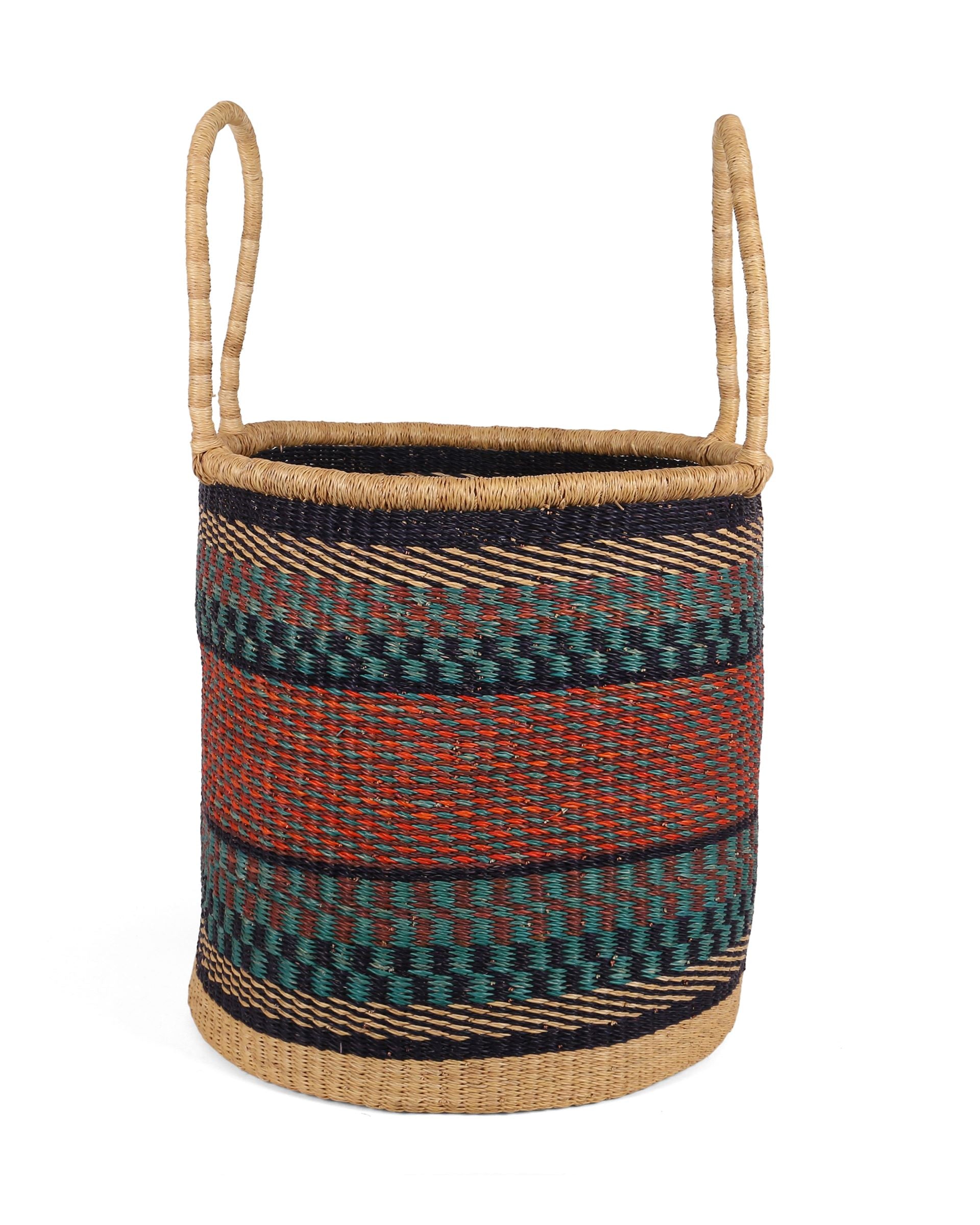 Declutter and bring a splash of Ghanaian colour to your home with the KOBE log basket, in sizes small, medium and large. With tribal-inspired patterns in teal, orange and brown, these tall baskets are perfect for storing kindling and logs by the fireside and are useful all over the home – as a laundry basket, toy basket, or blanket basket – the possibilities are endless! Every log basket in this collection is totally unique – made once and sold once.