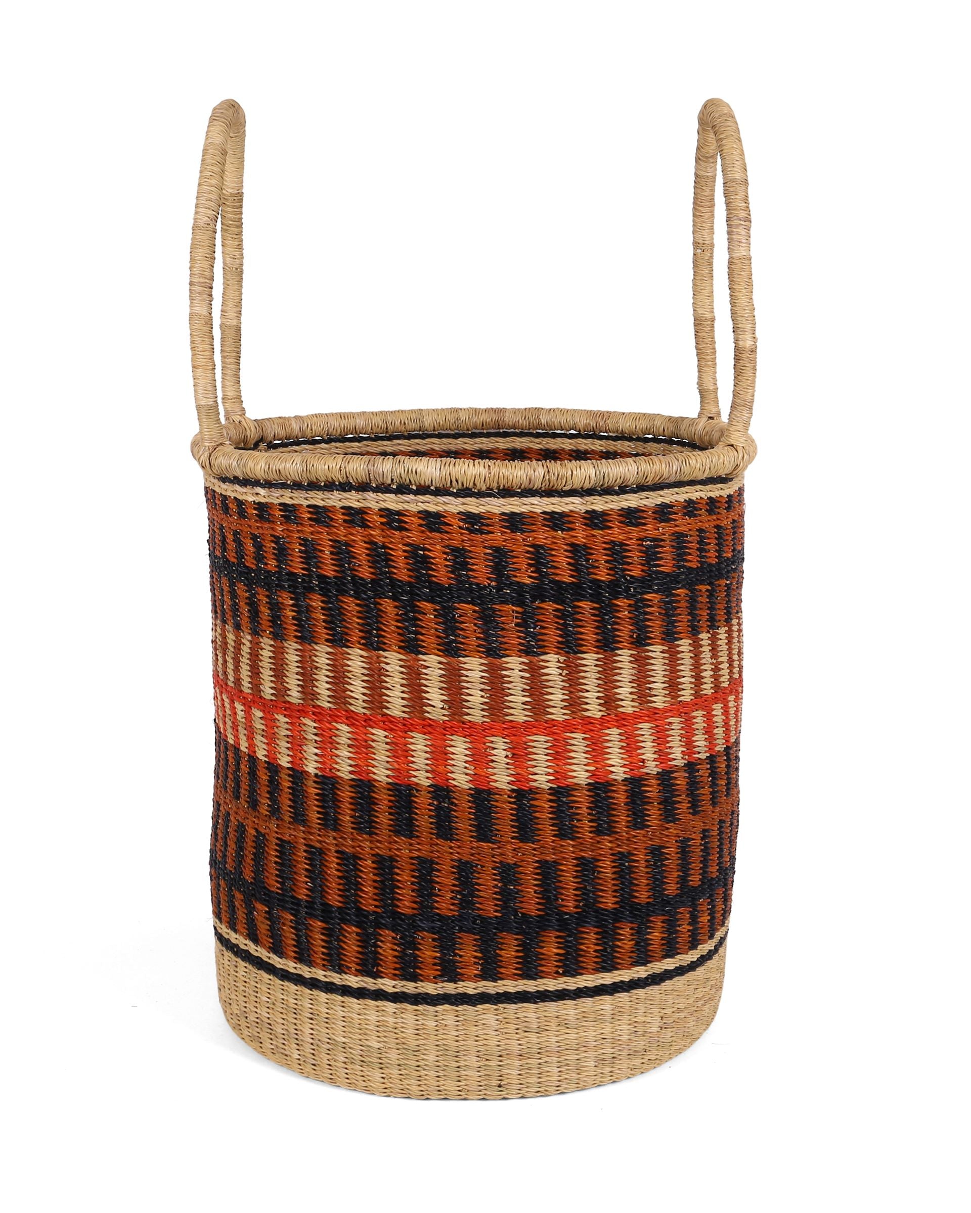 Makeover your fireplace and bring a splash of Ghanaian colour and texture to the home with the KODZO log basket, in sizes small, medium or large. With tribal patterns in brown, black and orange, these tall baskets are ideal for keeping logs in but work equally well as a laundry basket or general home storage. Every handwoven log basket in this collection is designed by the weaver and each one is different.