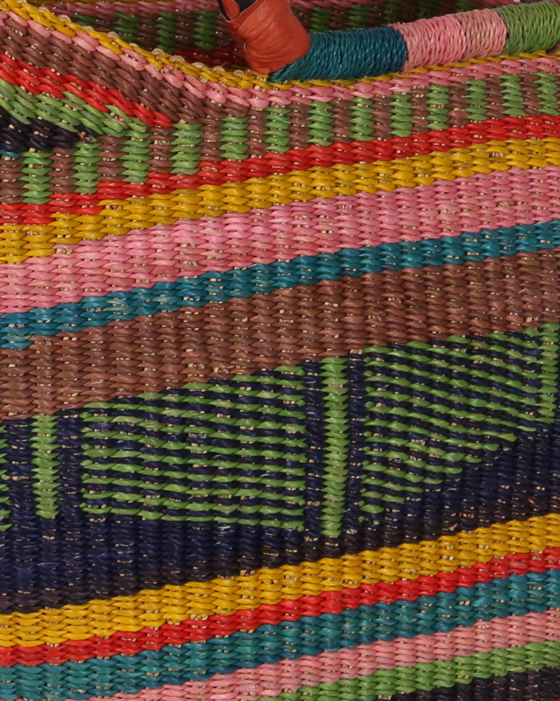 This exquisite NYANKPALA hand woven market basket has been produced in the traditional Ghanaian bolga basket style. Boasting tribal patterns of pink, green, yellow and blue, this basket is perfect for market trips or picnics, or used as a stylish solution to home storage. Fill with blankets, kindling, craft projects or toys – you’ll keep finding new uses for yours! Every market basket in this collection is unique – made once and sold once.