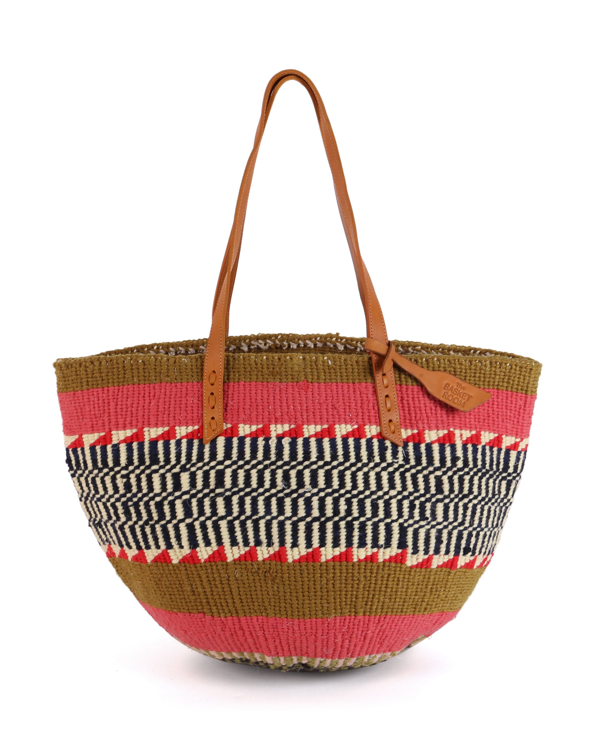 Introducing SIMA: a one-off woollen basket bag handwoven by the Kamba tribe in Kenya. Bolts of bright Brown, Pink, Blue & Red pop against a natural base, creating a distinctly tribal effect.